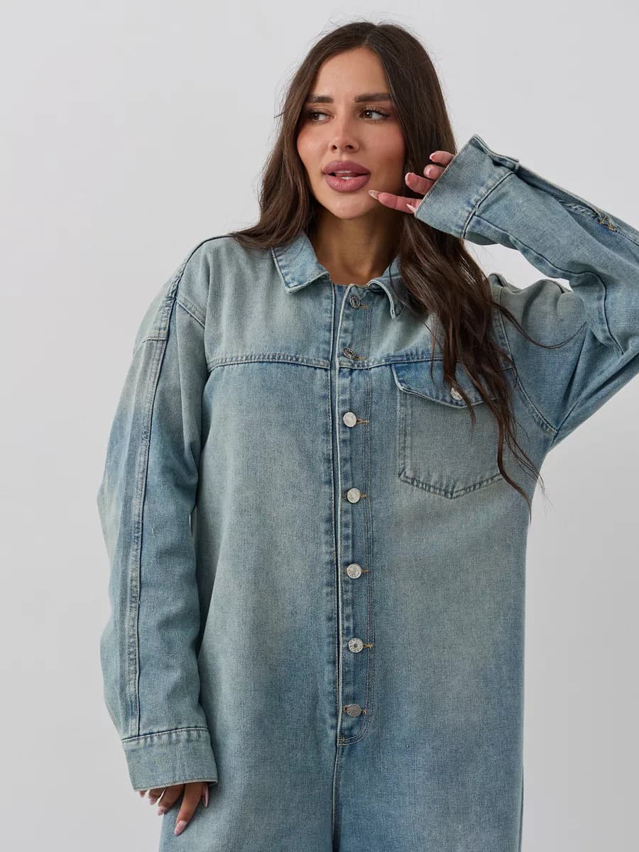 Стильный джинсовый комбинезон oversize из плотного денима. Свободный крой, удобные карманы, металлическая фурнитура. Идеален для повседневных образов.