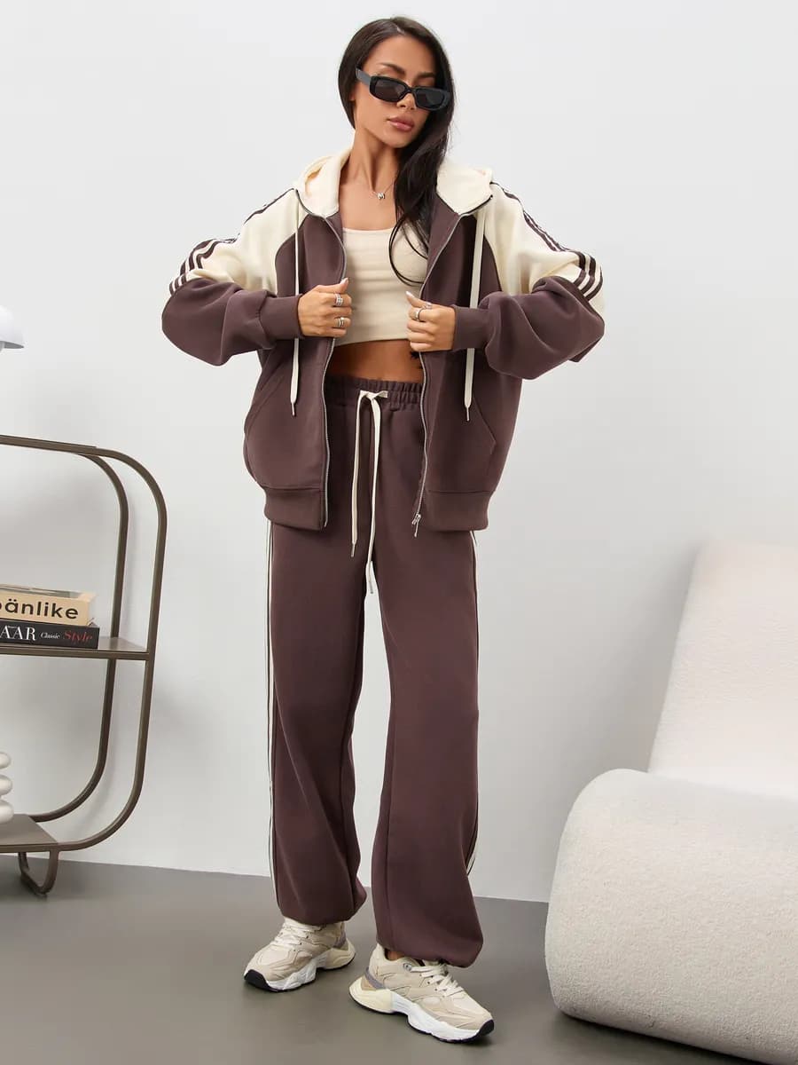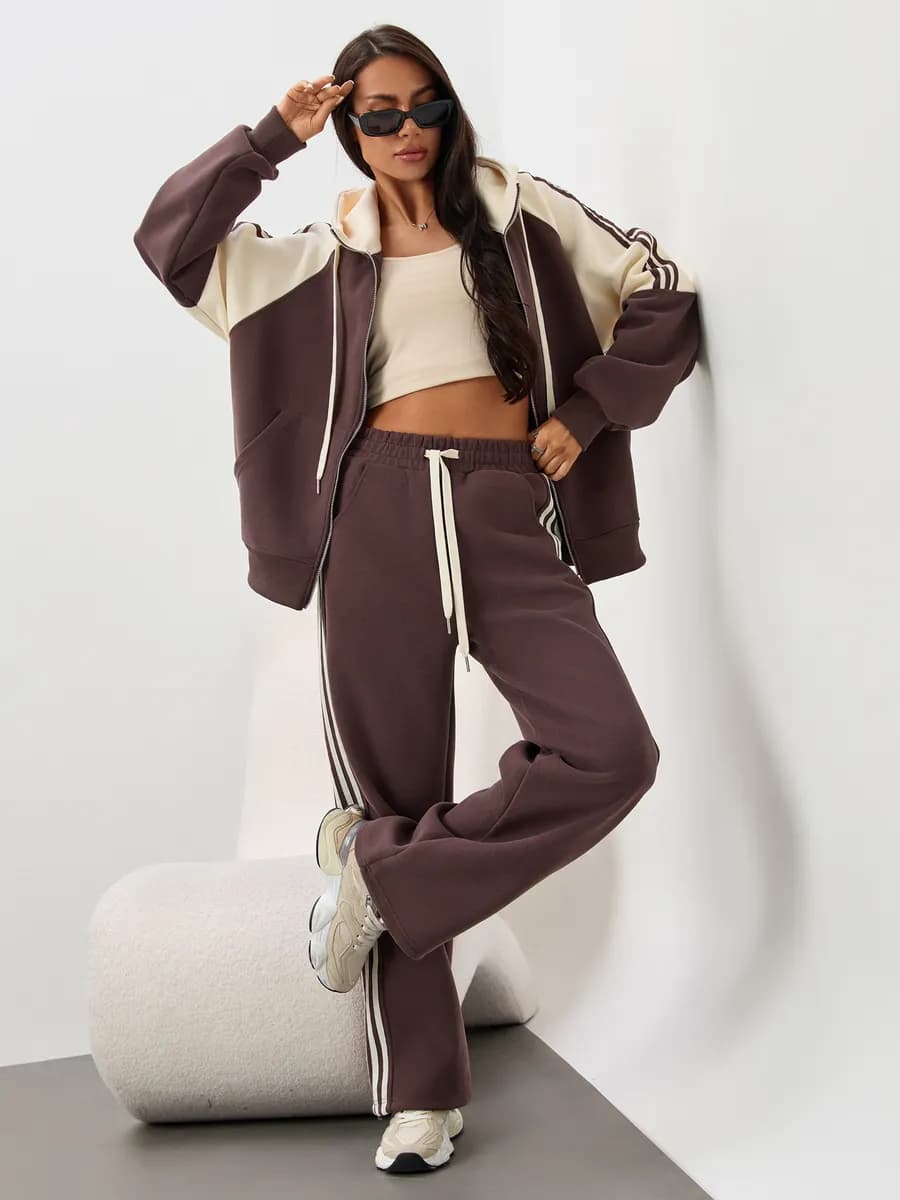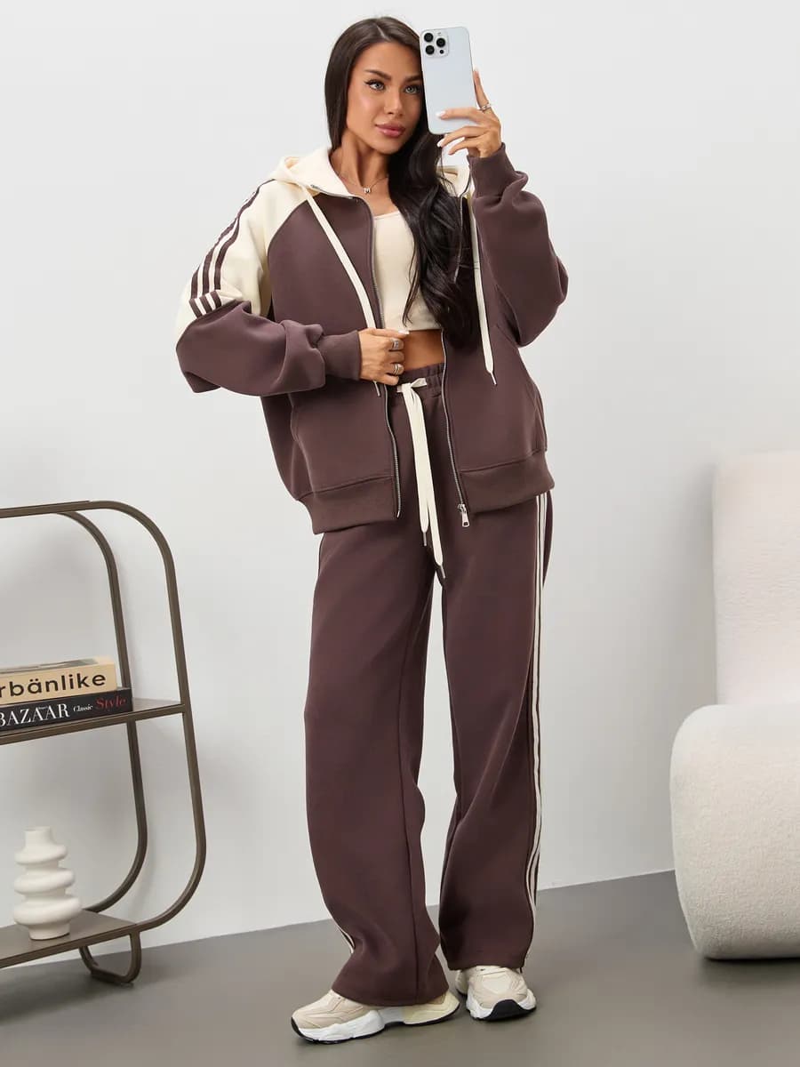 Спортивный костюм oversize с лампасами: укороченная куртка на молнии и широкие брюки. Контрастные вставки молочного цвета, мягкая ткань с начёсом. Стильная повседневная классика.