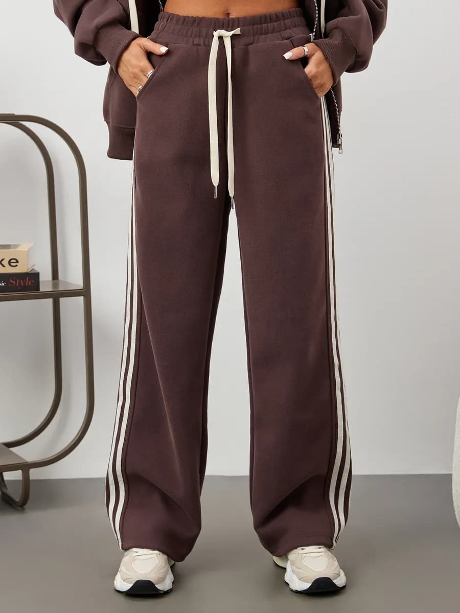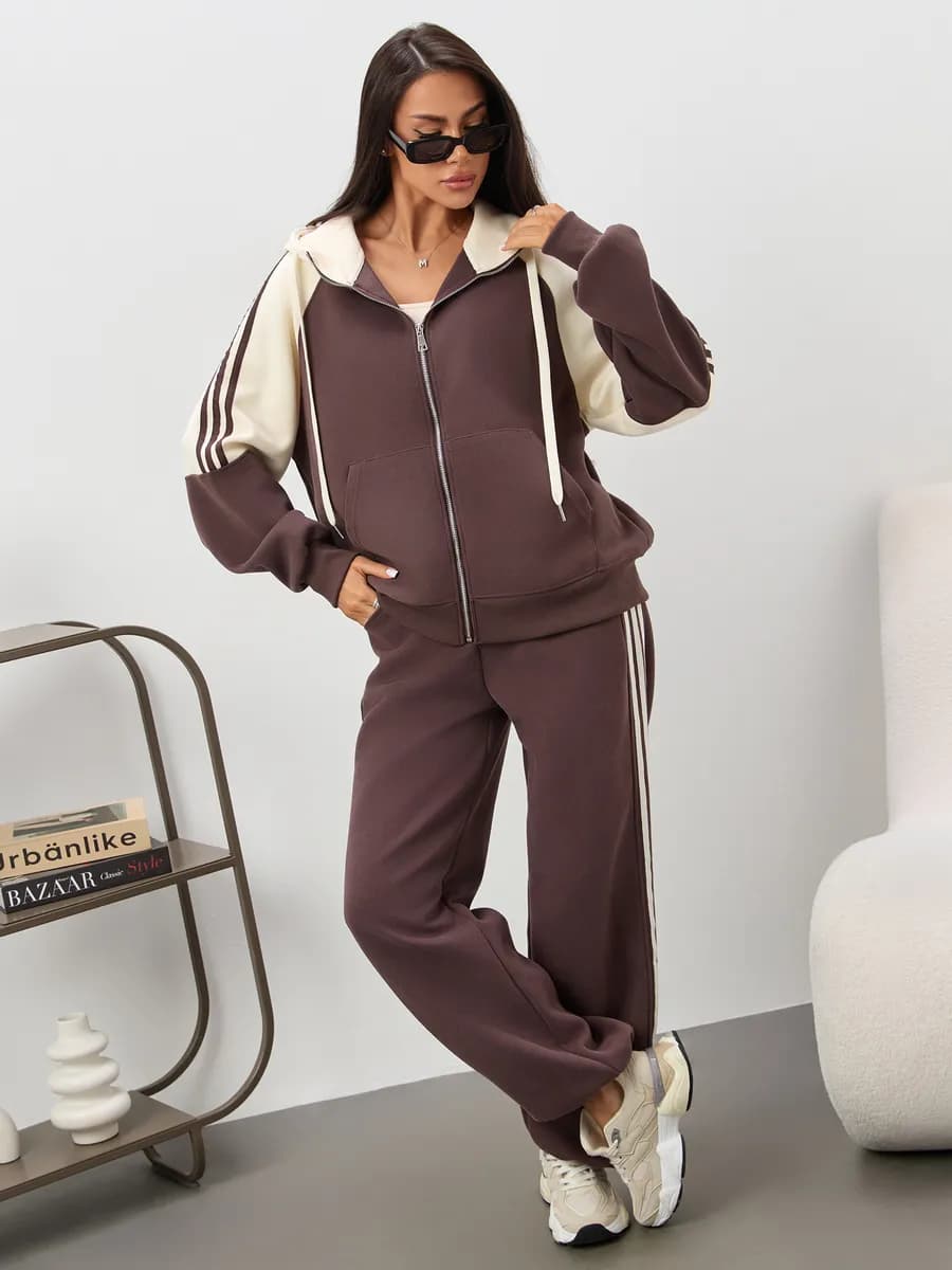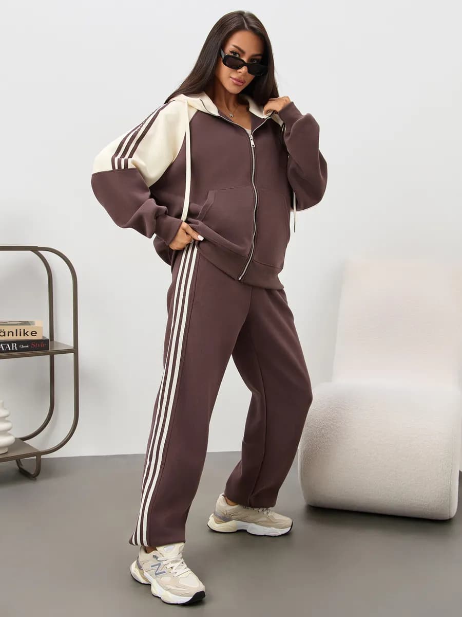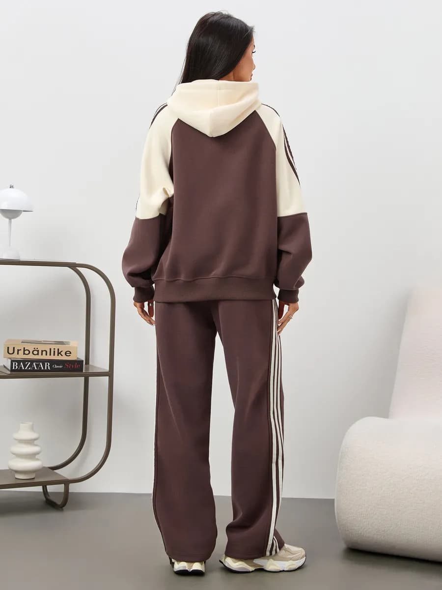 Спортивный костюм oversize с лампасами: укороченная куртка на молнии и широкие брюки. Контрастные вставки молочного цвета, мягкая ткань с начёсом. Стильная повседневная классика.