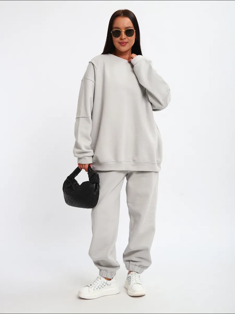 Авторский костюм со свитшотом и брюками-джоггерами. Мягкая ткань с peach-эффектом, oversize крой, резинка на манжетах. Идеальный баланс комфорта и стиля.