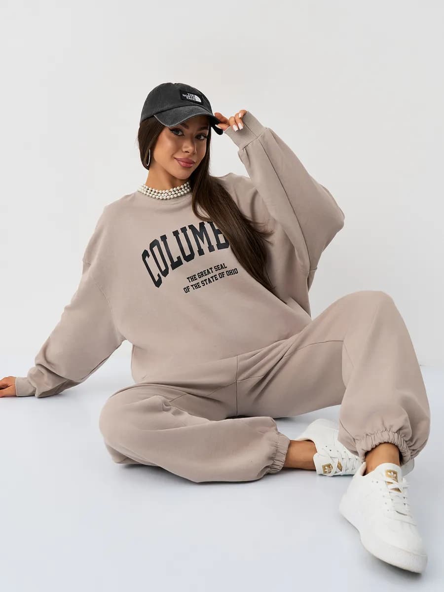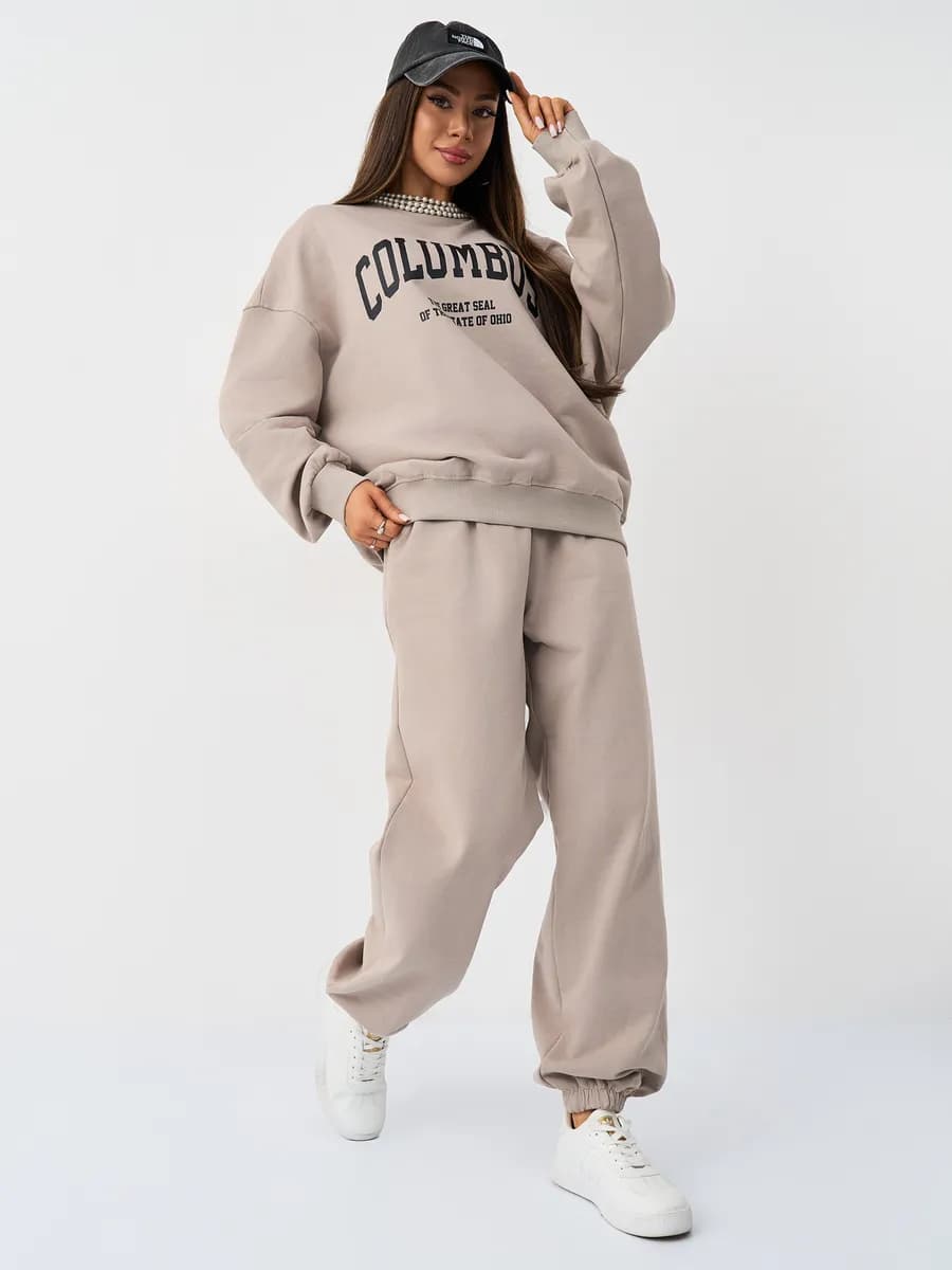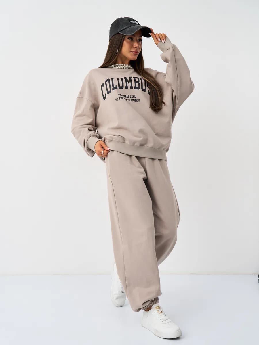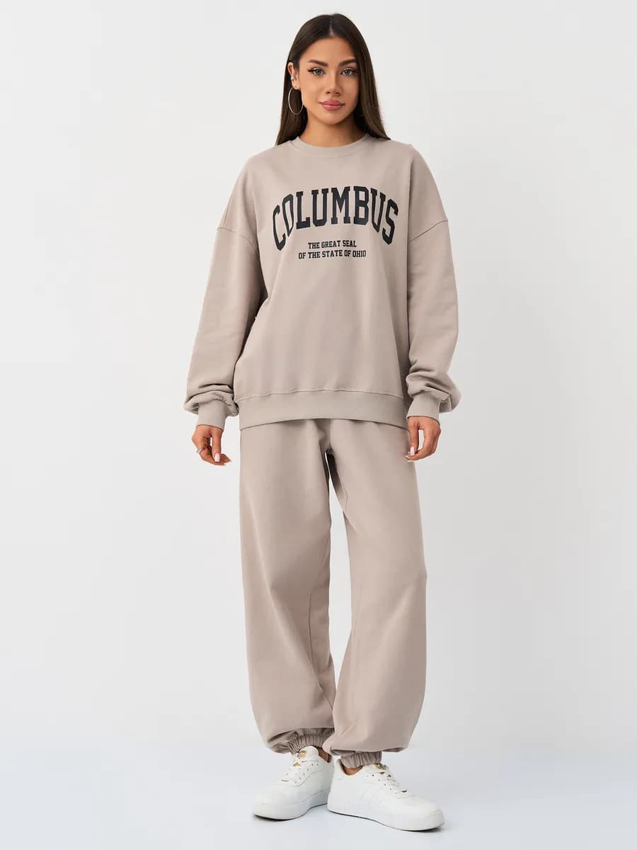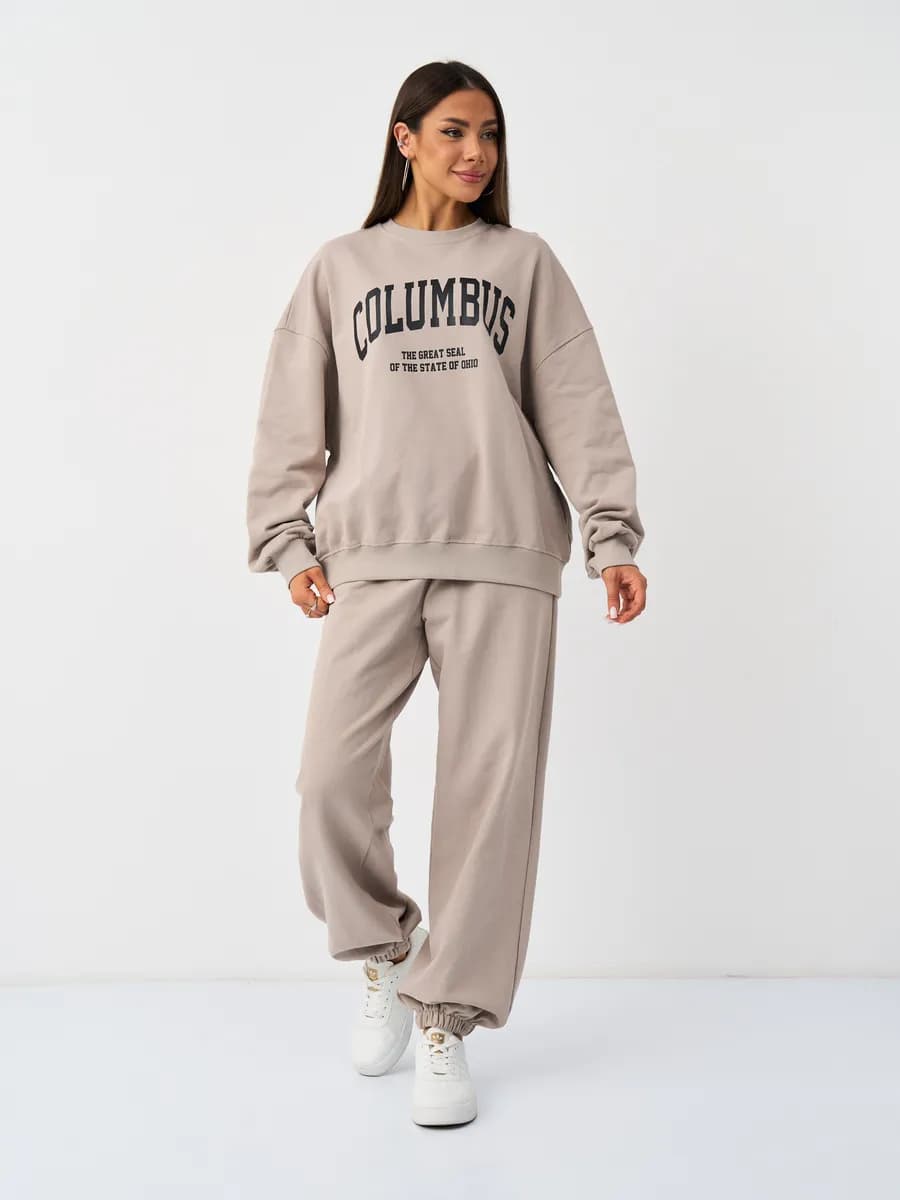 Спортивный костюм oversize со свитшотом и принтом Columbus и широкими брюками-джоггерами. Тёплая хлопковая ткань с начёсом, свободная посадка, манжеты на резинке. Один размер на 42–48.