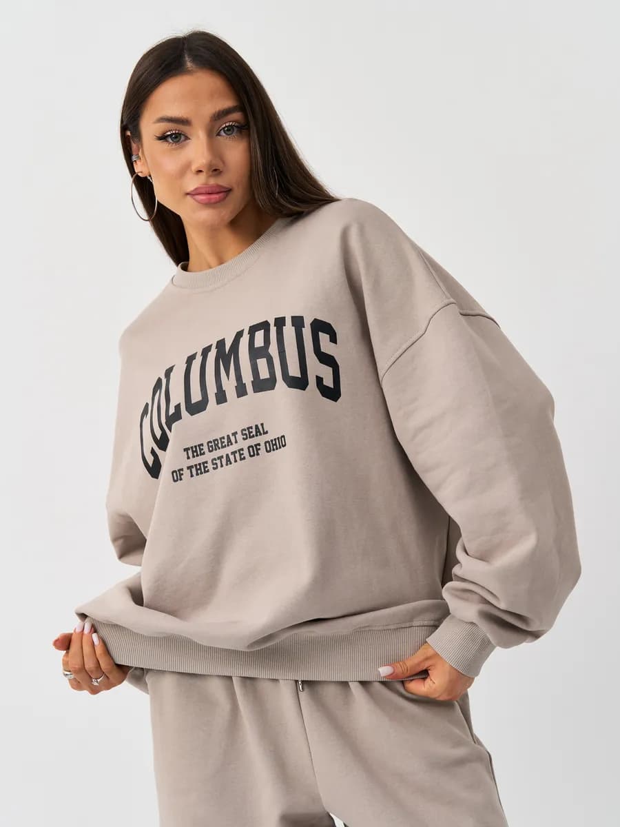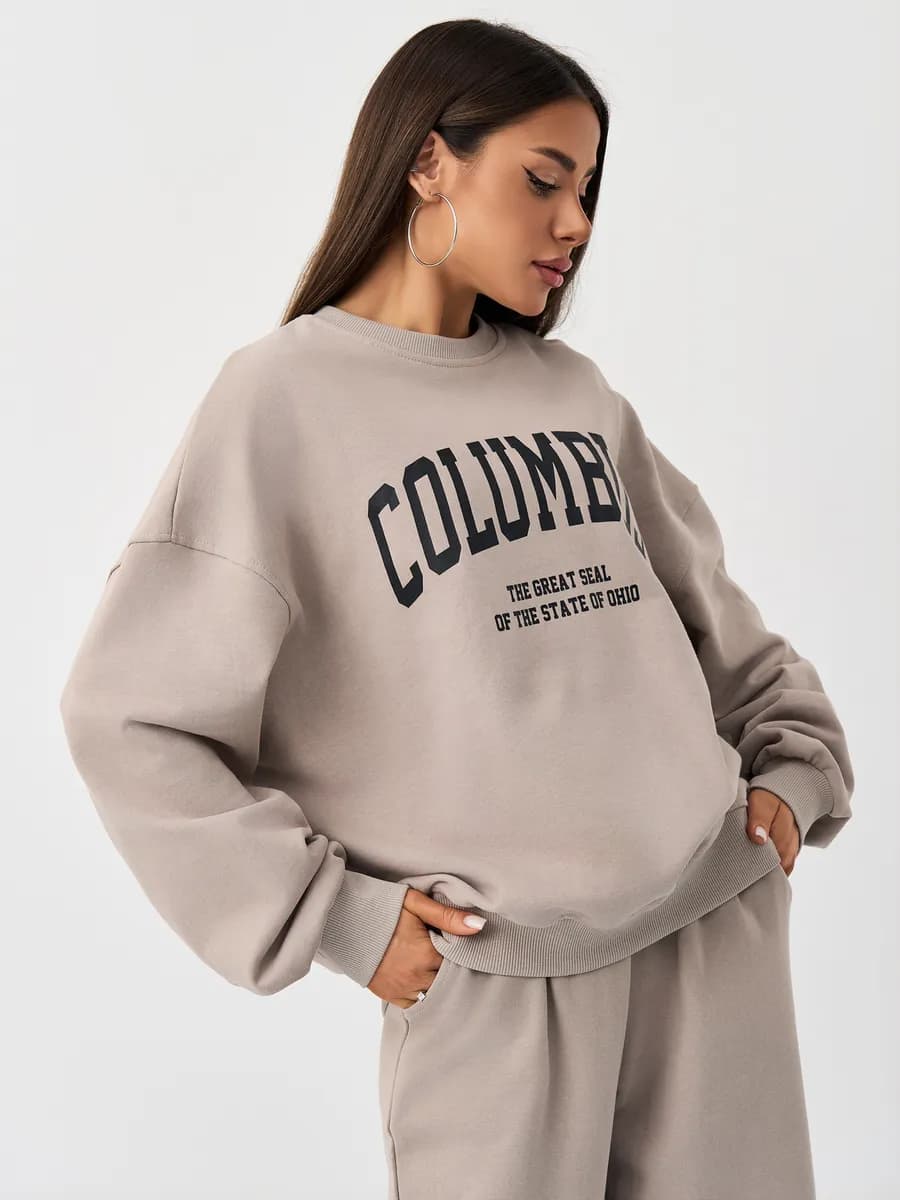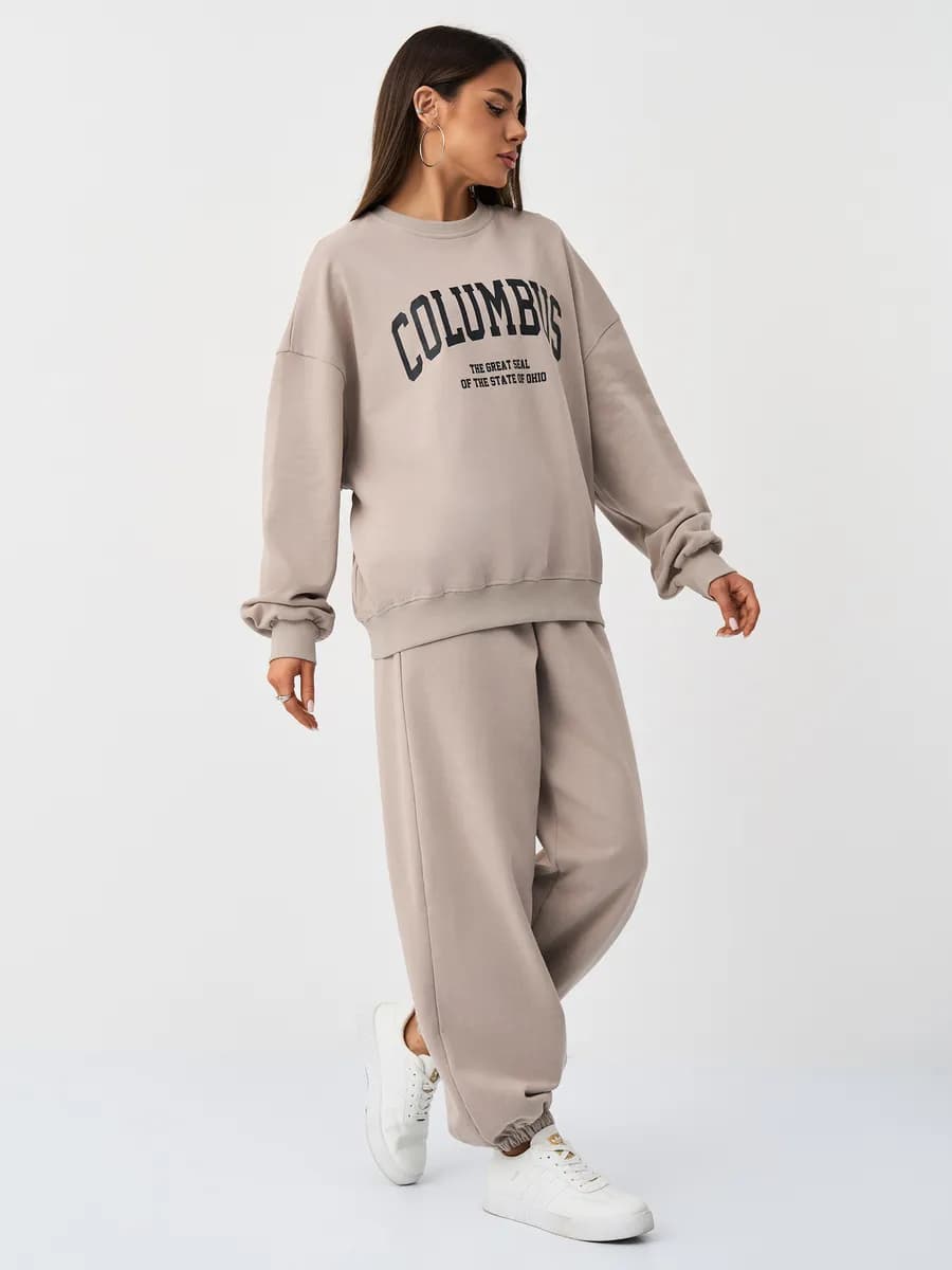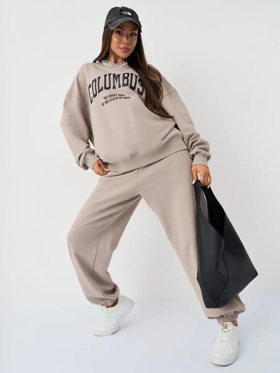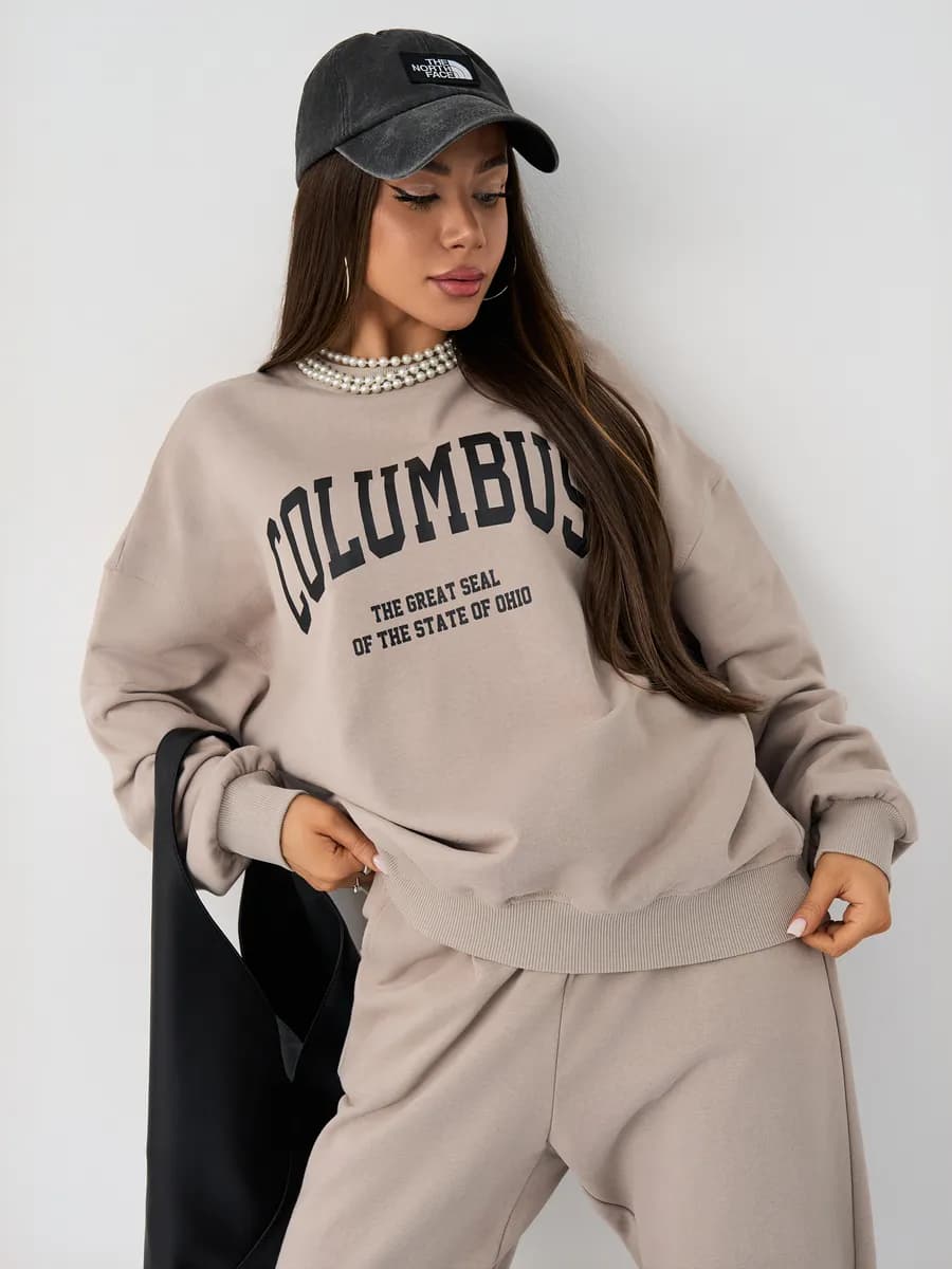 Спортивный костюм oversize со свитшотом и принтом Columbus и широкими брюками-джоггерами. Тёплая хлопковая ткань с начёсом, свободная посадка, манжеты на резинке. Один размер на 42–48.