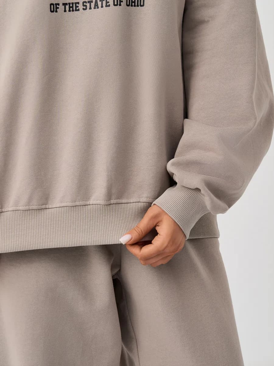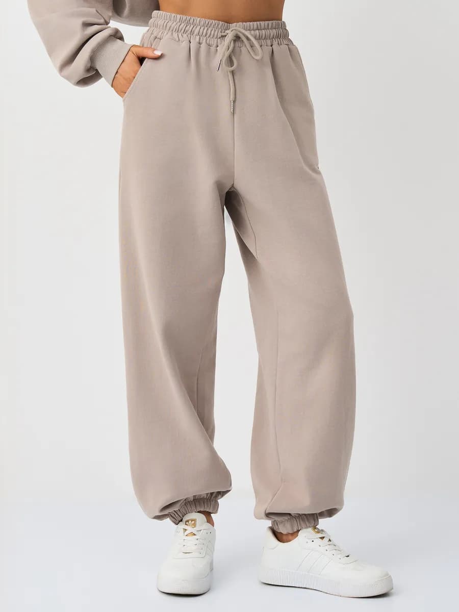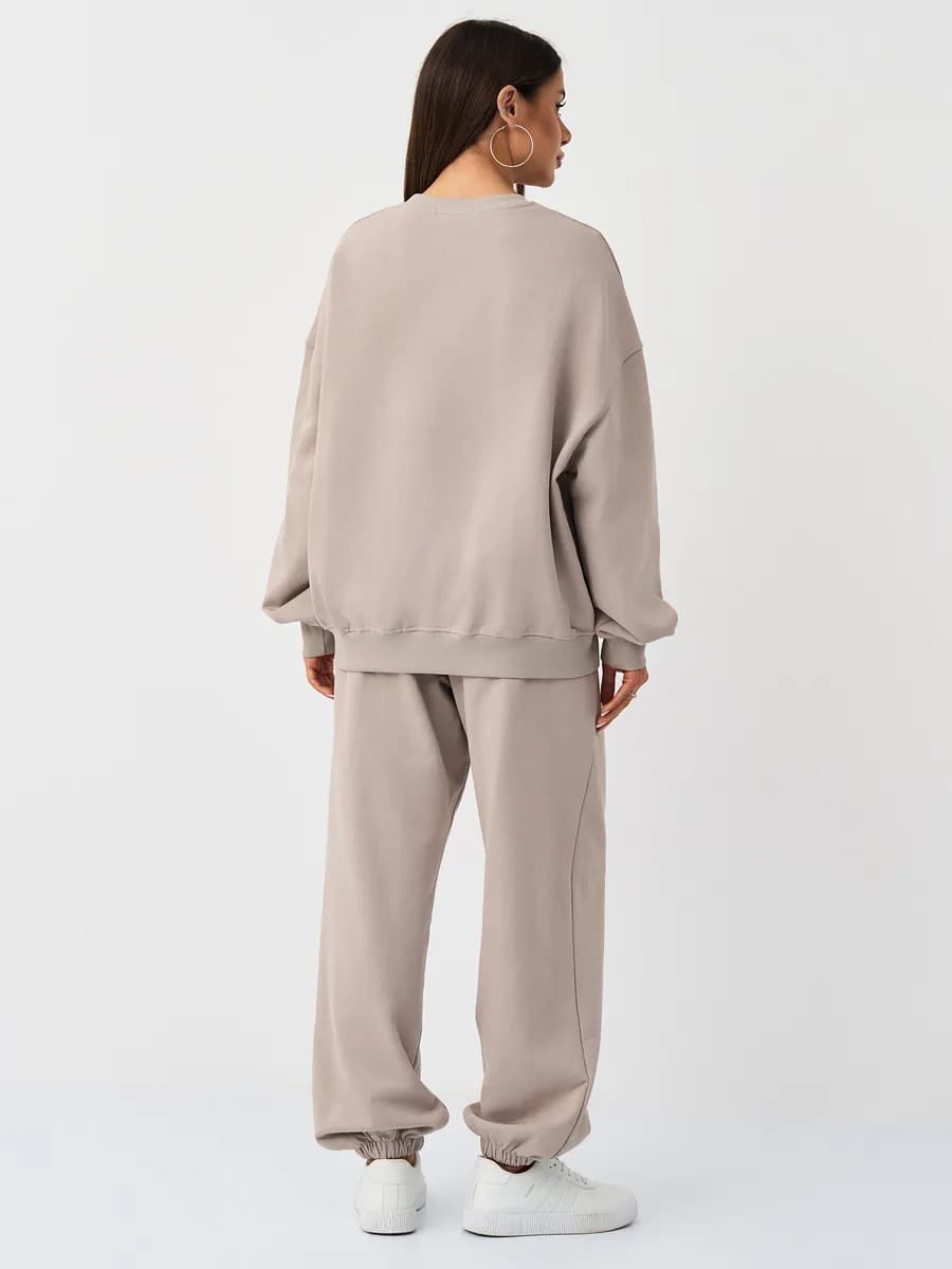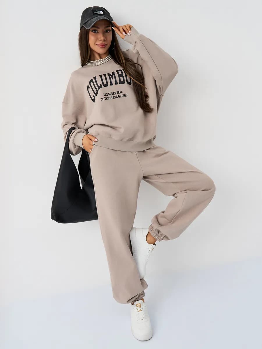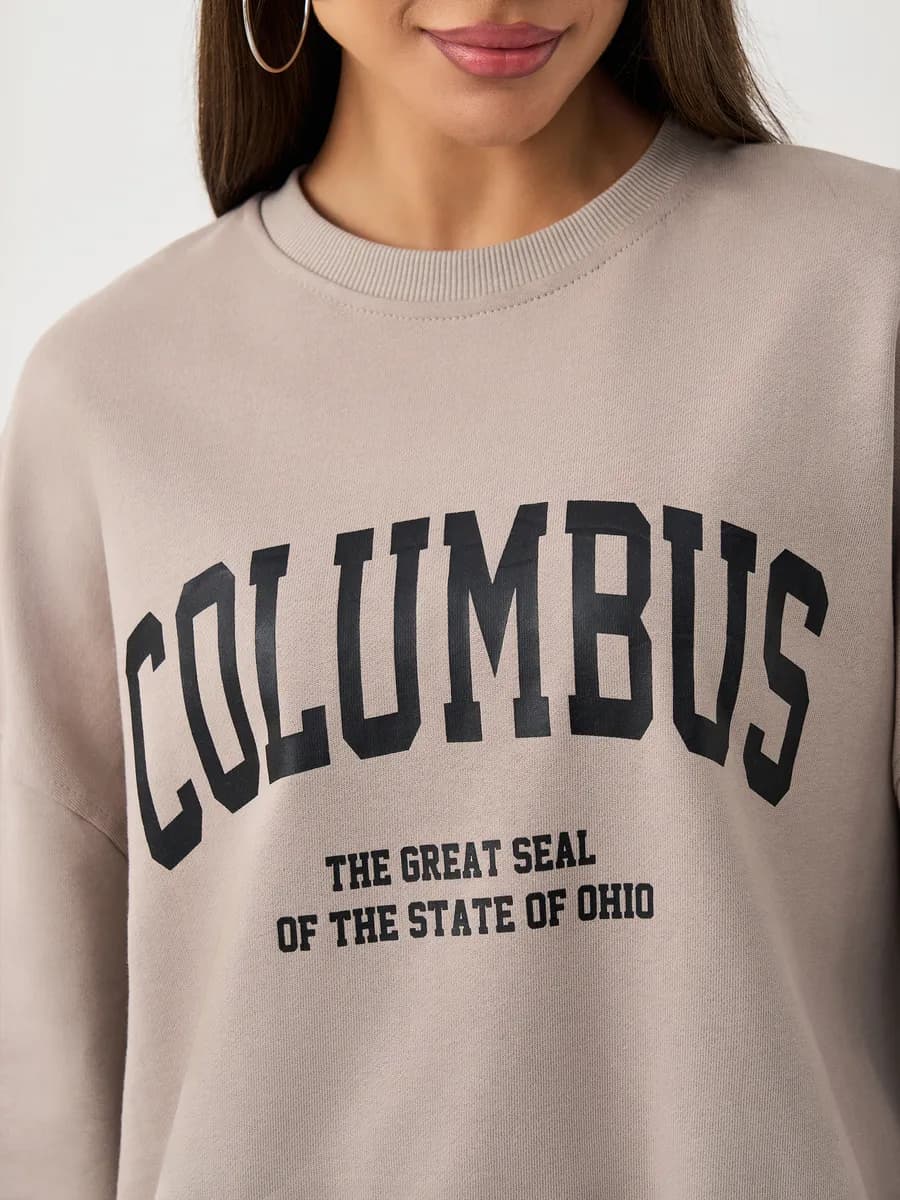 Спортивный костюм oversize со свитшотом и принтом Columbus и широкими брюками-джоггерами. Тёплая хлопковая ткань с начёсом, свободная посадка, манжеты на резинке. Один размер на 42–48.