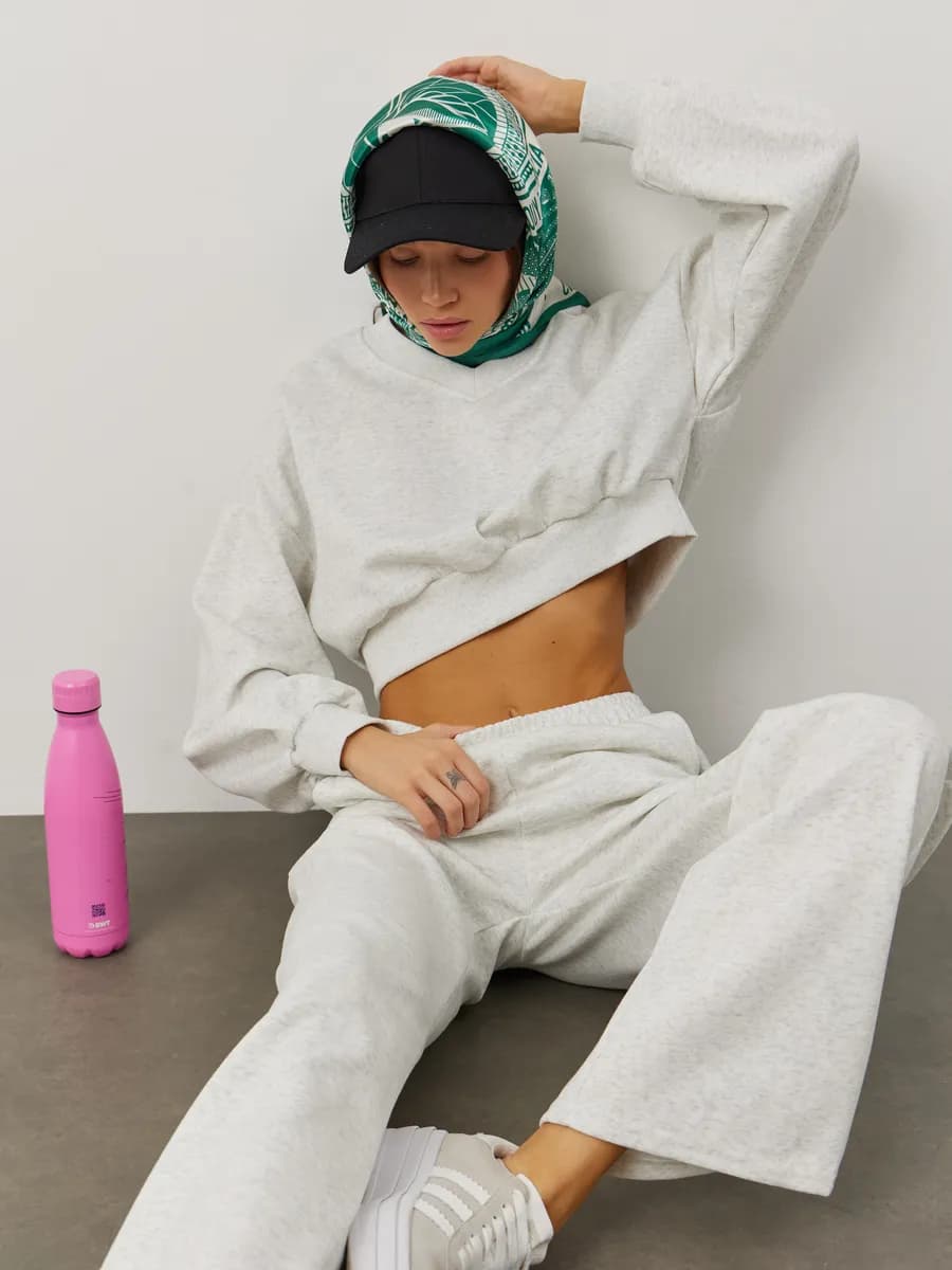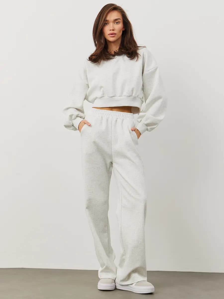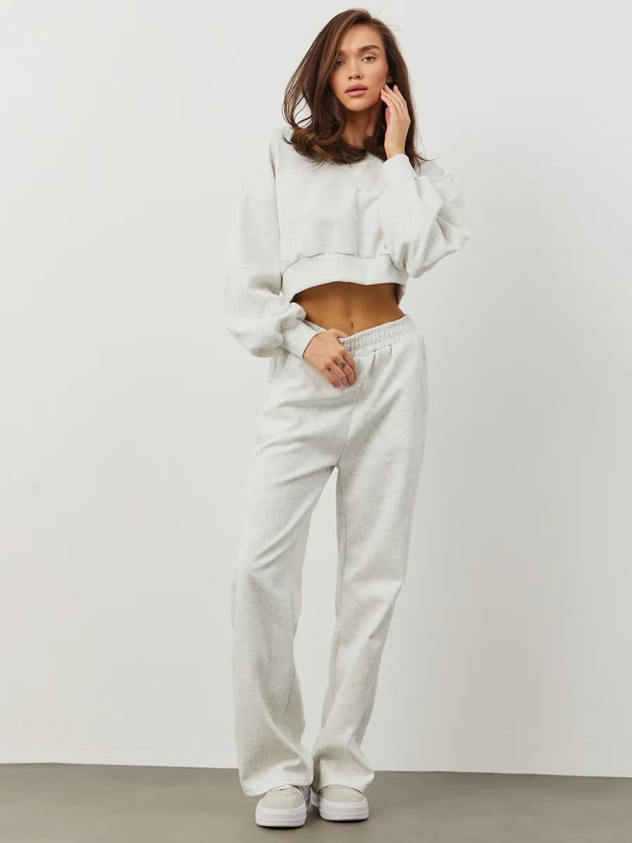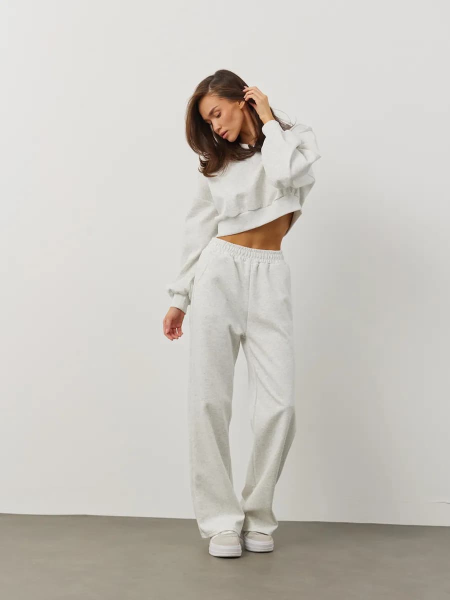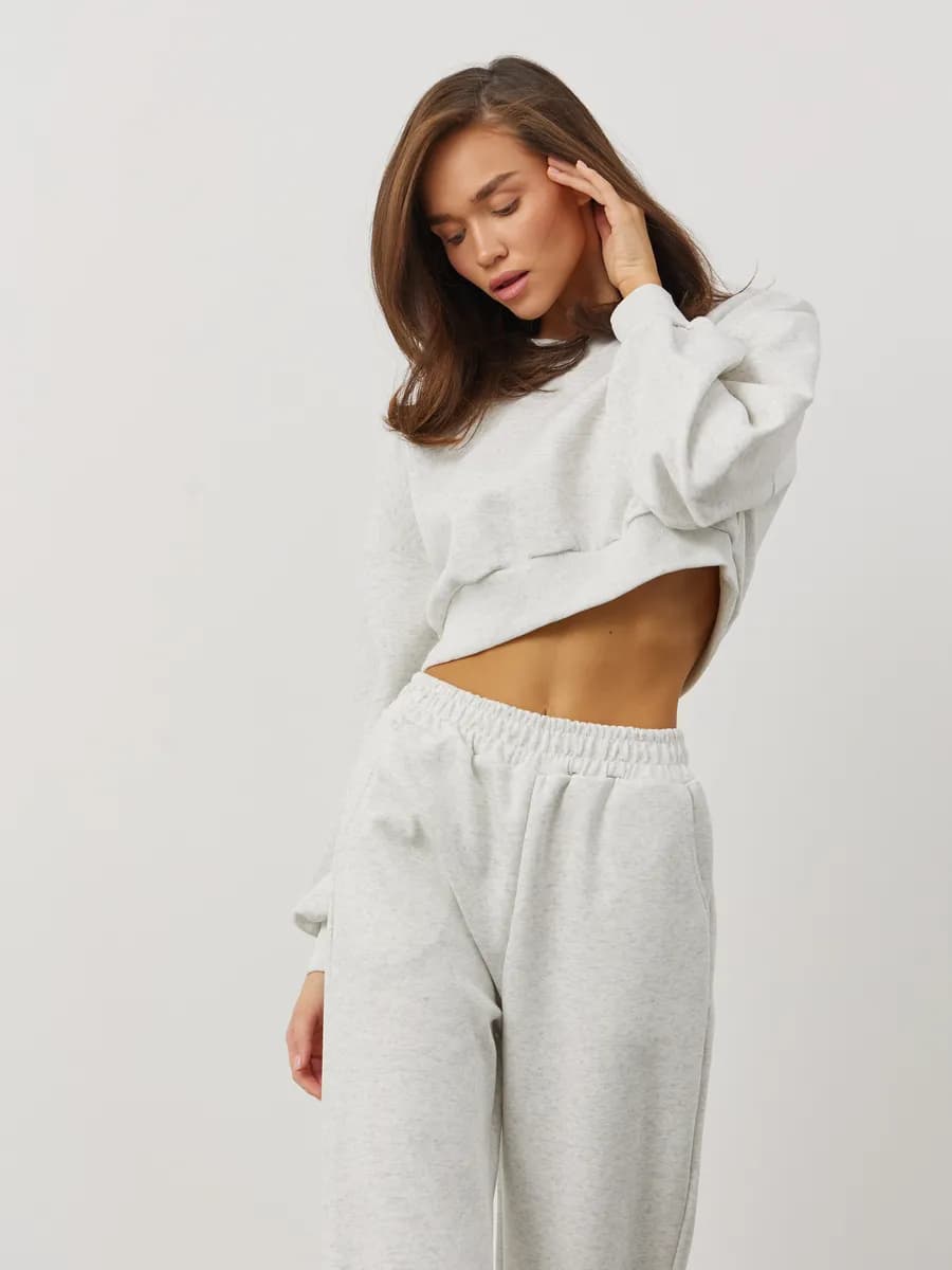 Спортивный костюм с укороченным свитшотом и прямыми брюками. Широкие рукава oversize, резинка в поясе, лёгкая ткань без начёса. Светло-серый меланж для повседневных образов.