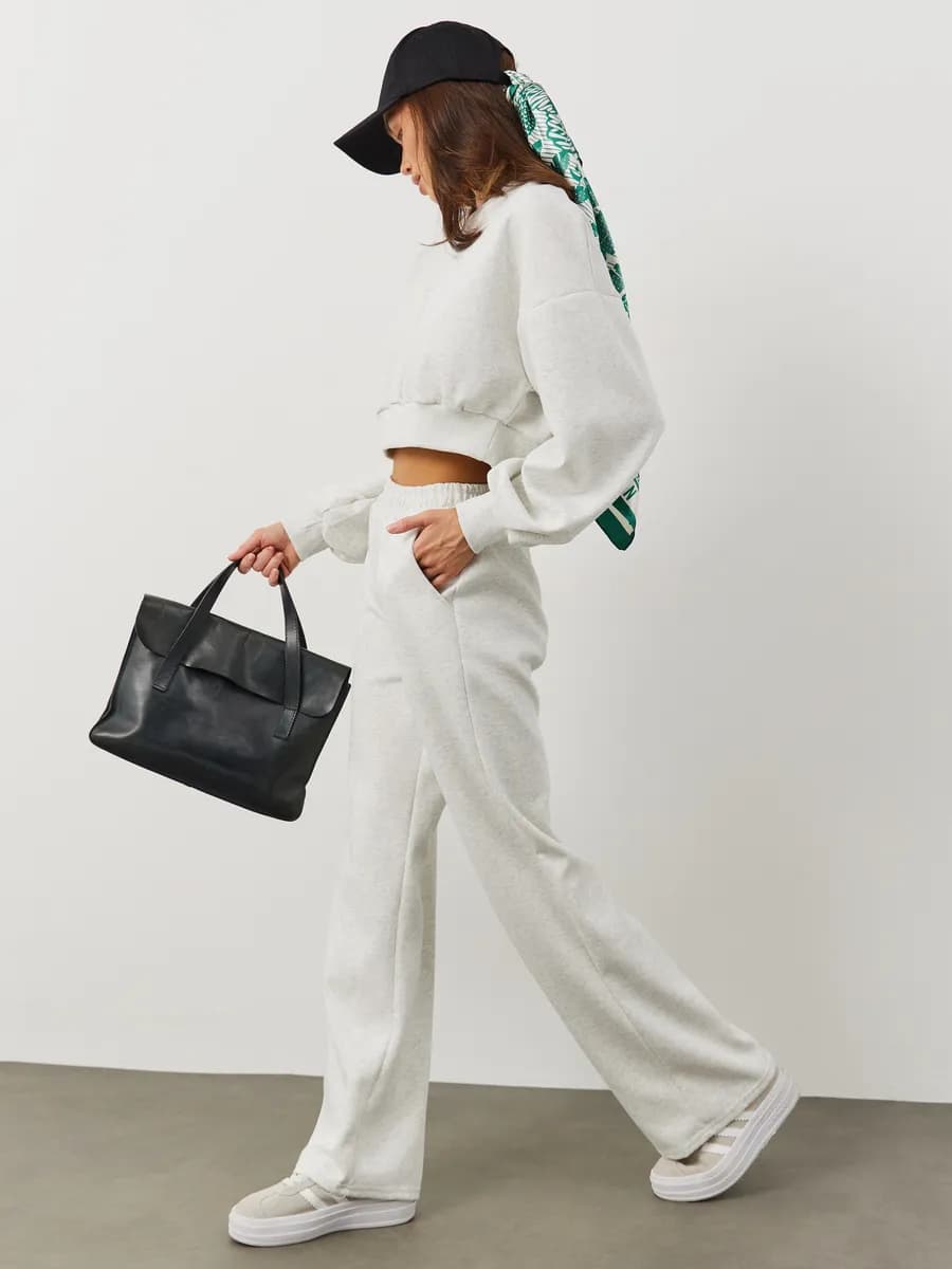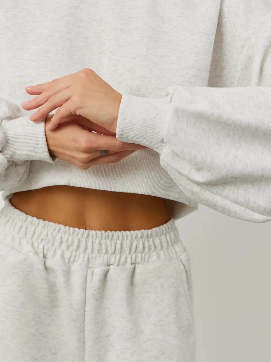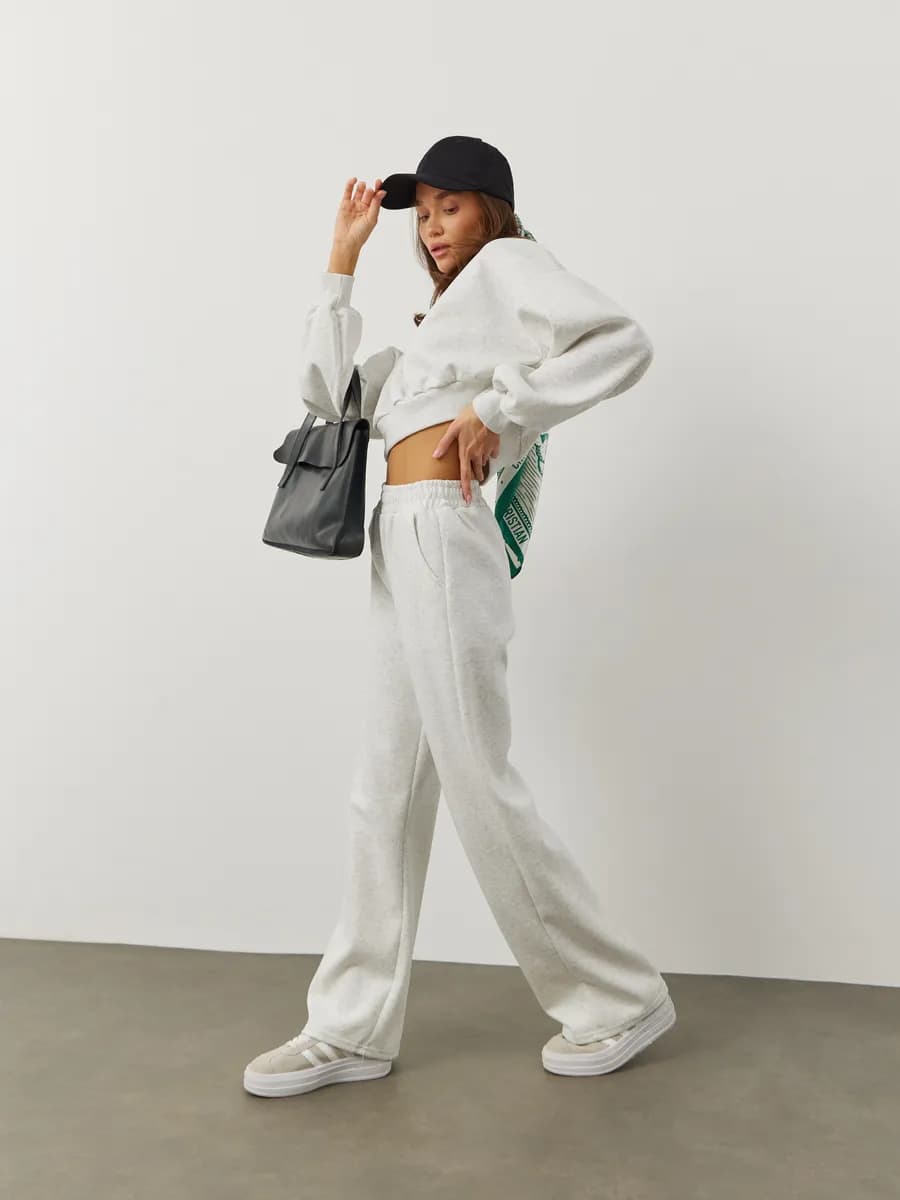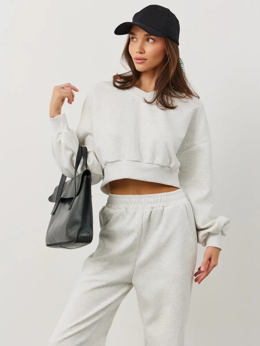 Спортивный костюм с укороченным свитшотом и прямыми брюками. Широкие рукава oversize, резинка в поясе, лёгкая ткань без начёса. Светло-серый меланж для повседневных образов.