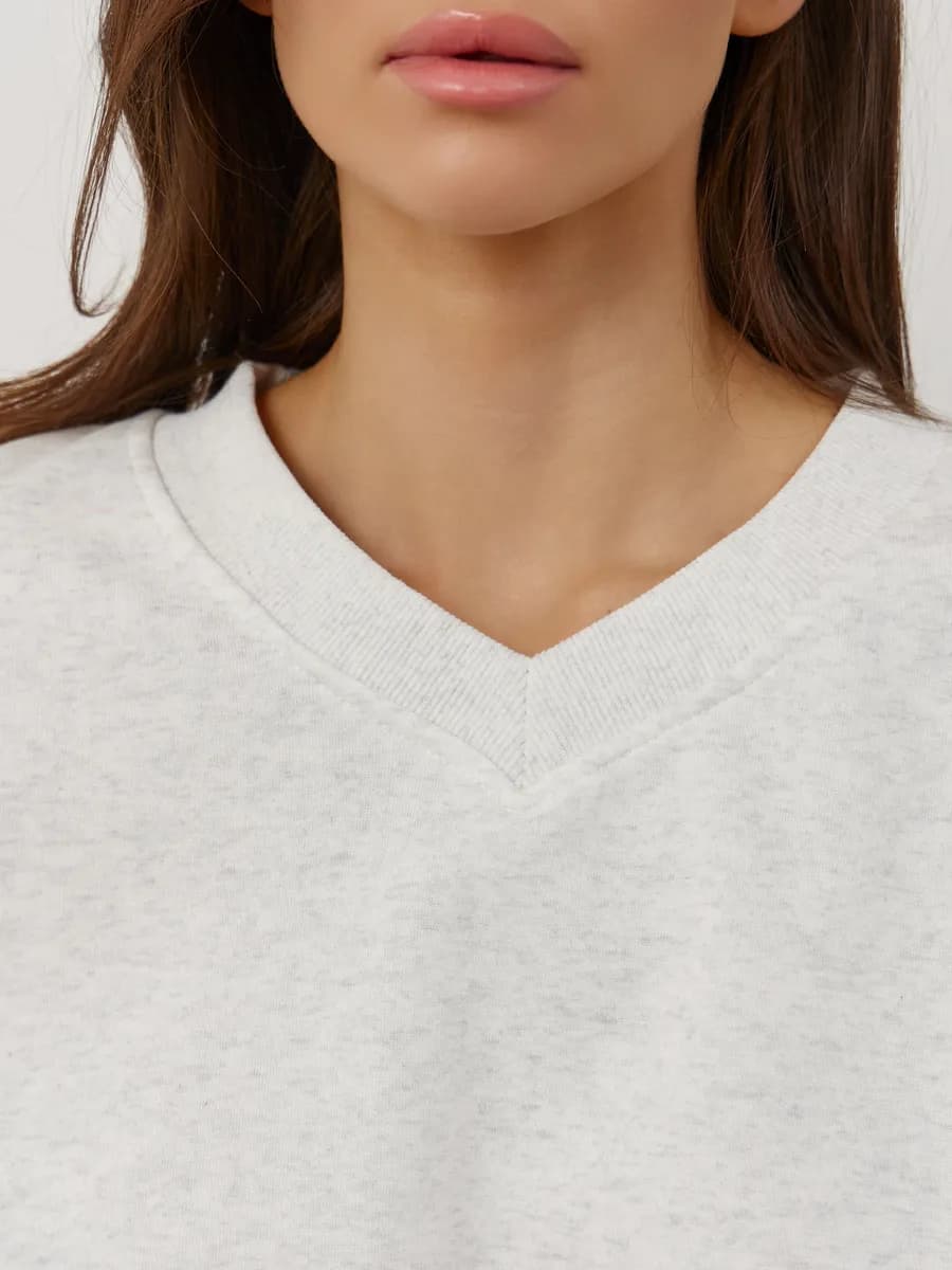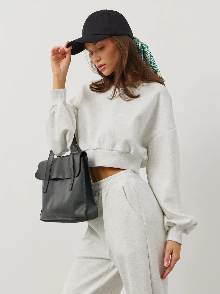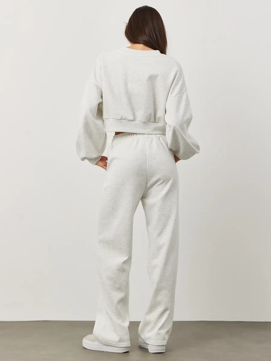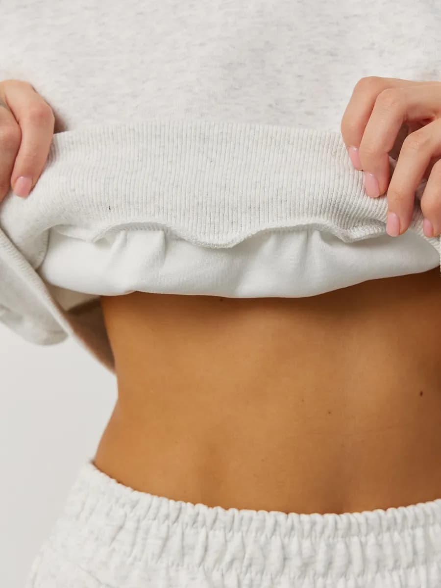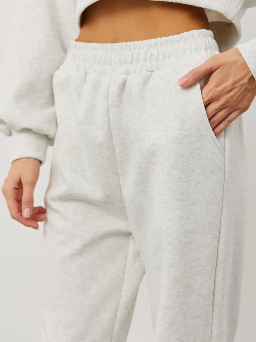 Спортивный костюм с укороченным свитшотом и прямыми брюками. Широкие рукава oversize, резинка в поясе, лёгкая ткань без начёса. Светло-серый меланж для повседневных образов.