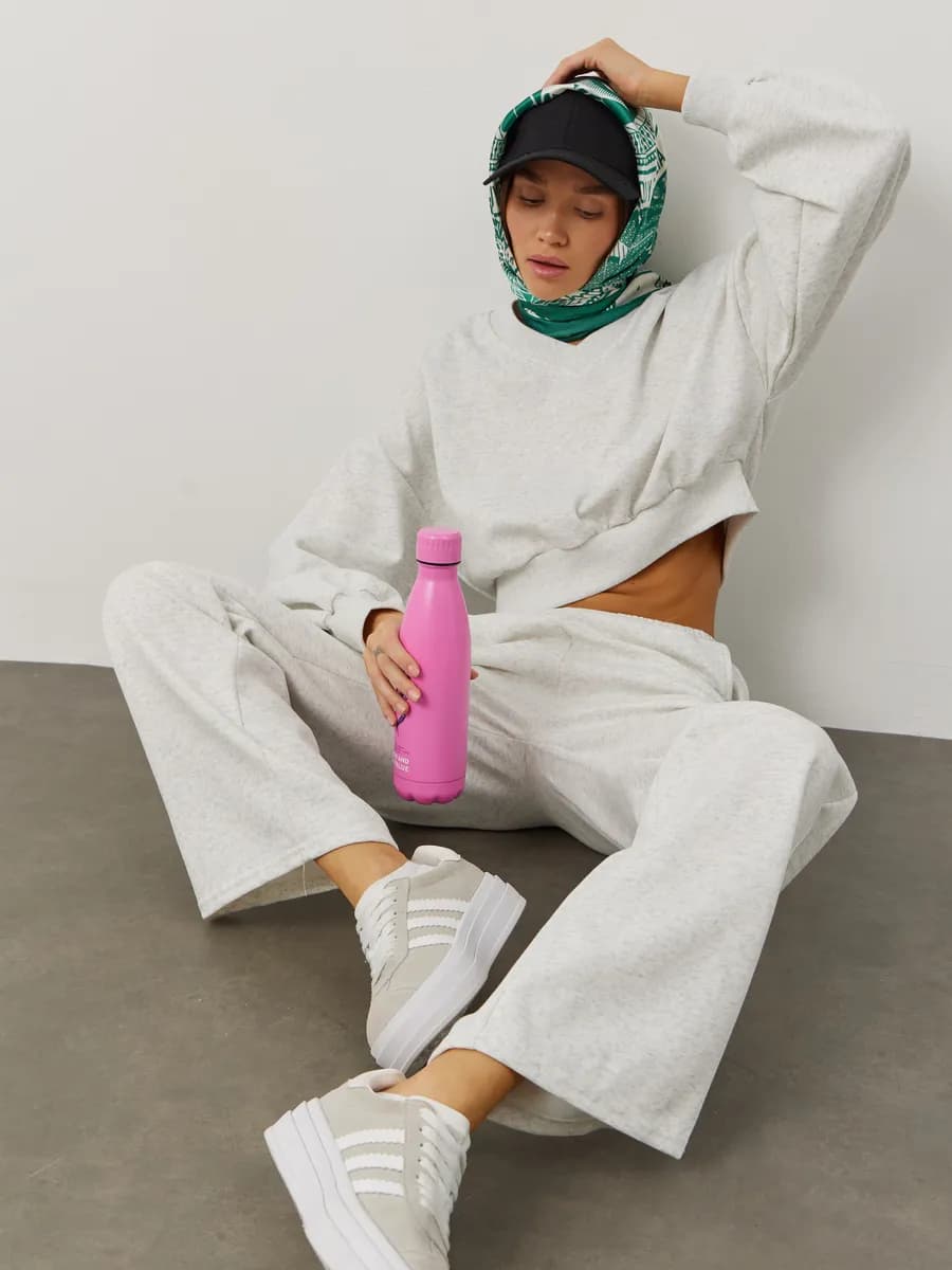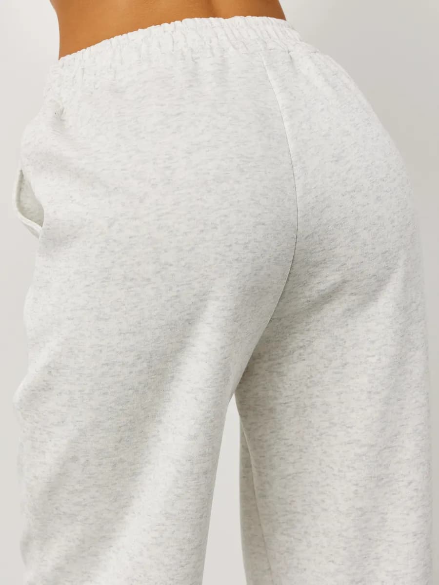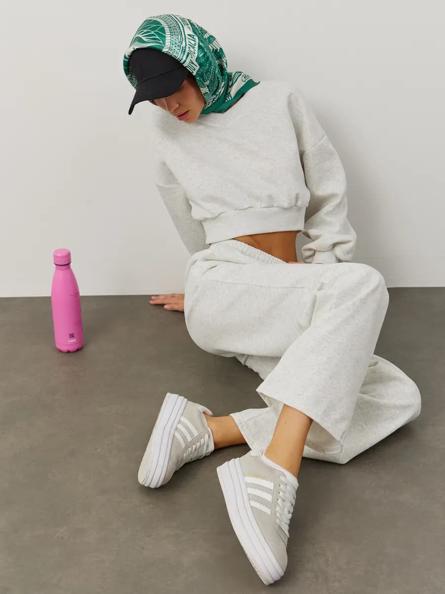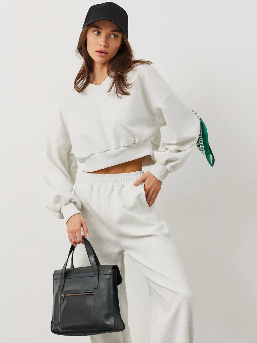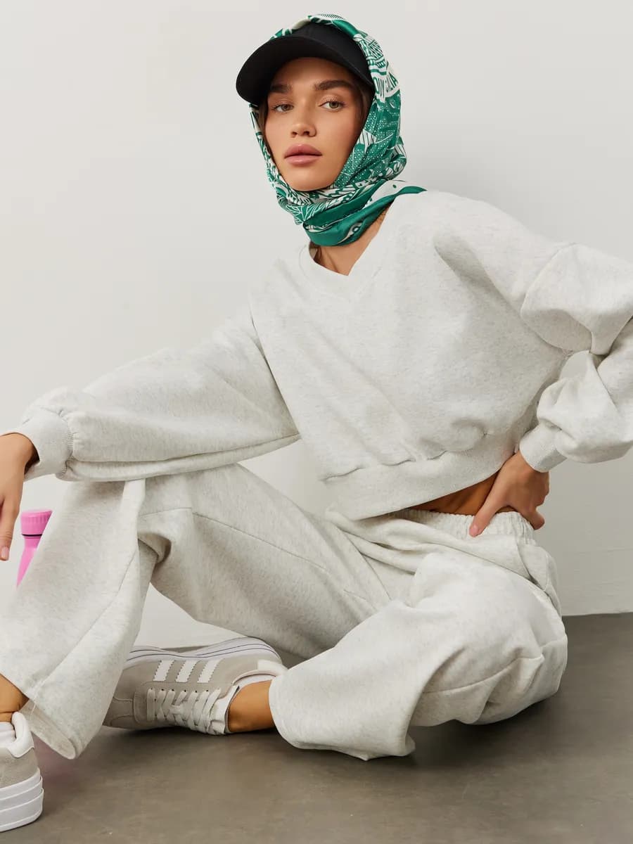 Спортивный костюм с укороченным свитшотом и прямыми брюками. Широкие рукава oversize, резинка в поясе, лёгкая ткань без начёса. Светло-серый меланж для повседневных образов.