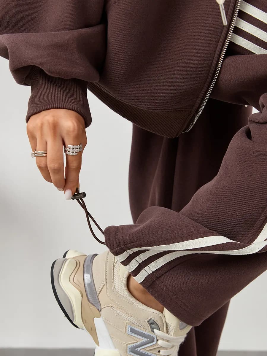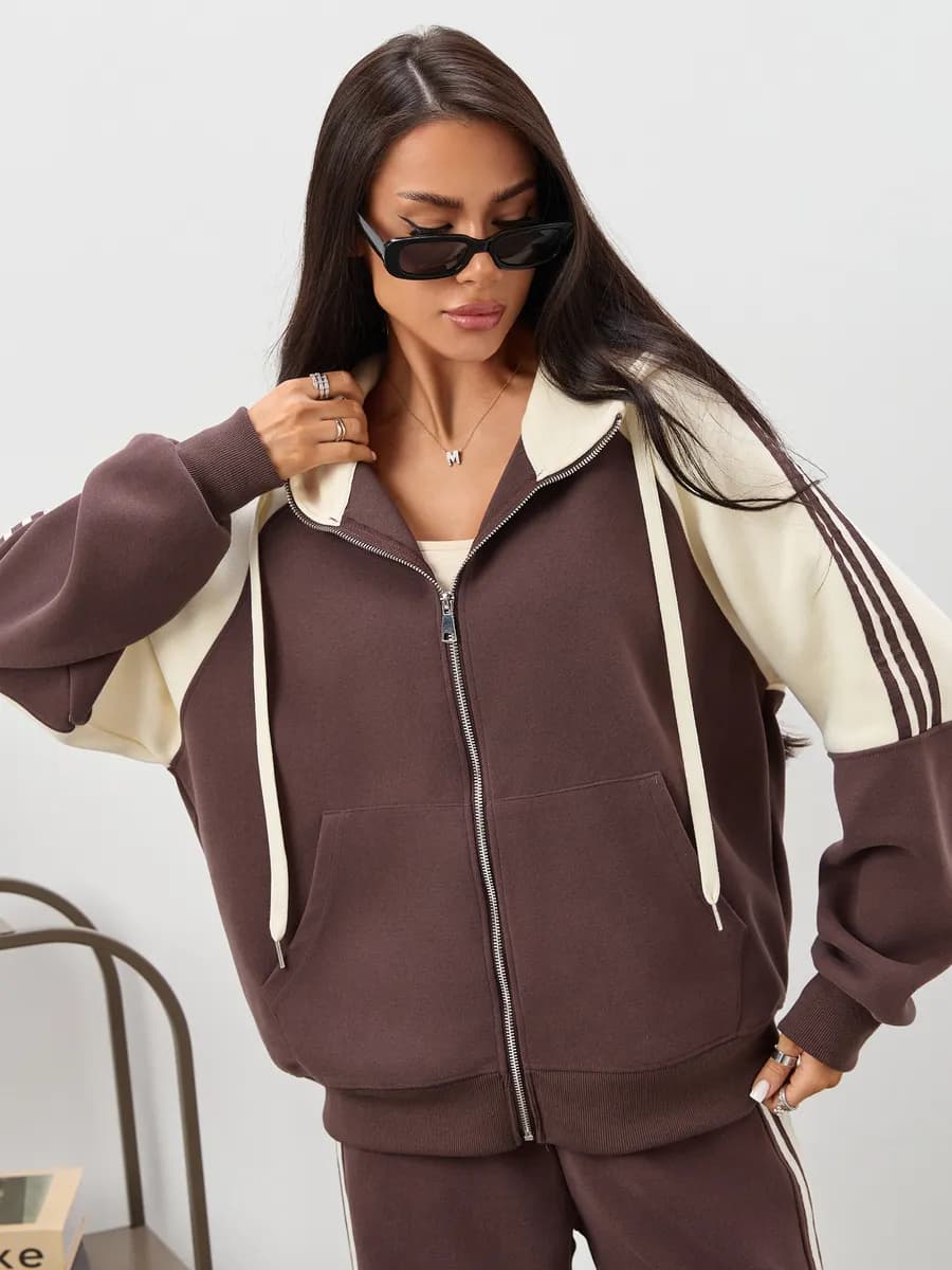 Спортивный костюм oversize с лампасами: укороченная куртка на молнии и широкие брюки. Контрастные вставки молочного цвета, мягкая ткань с начёсом. Стильная повседневная классика.