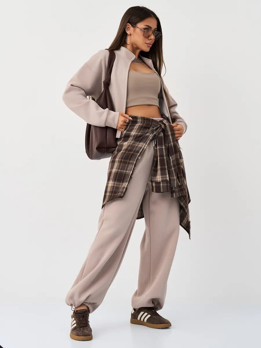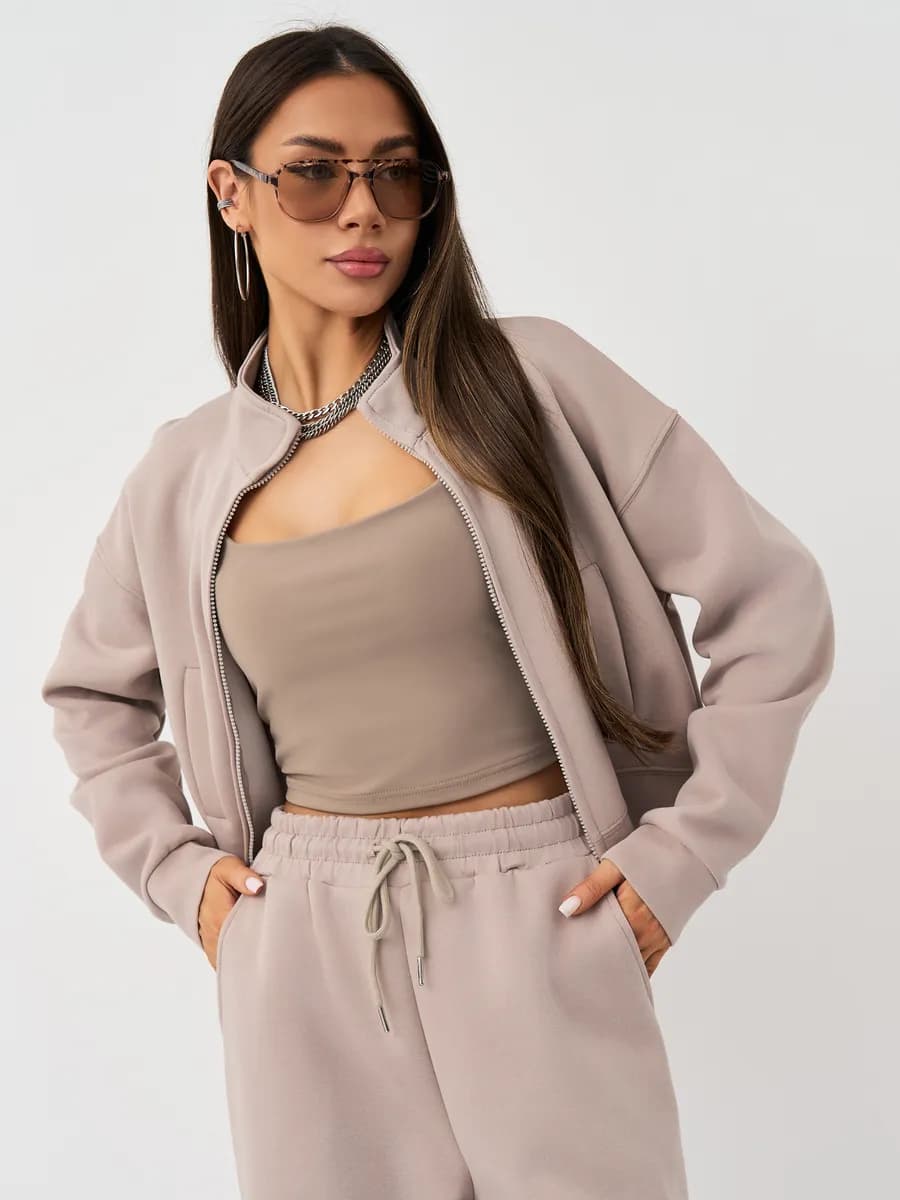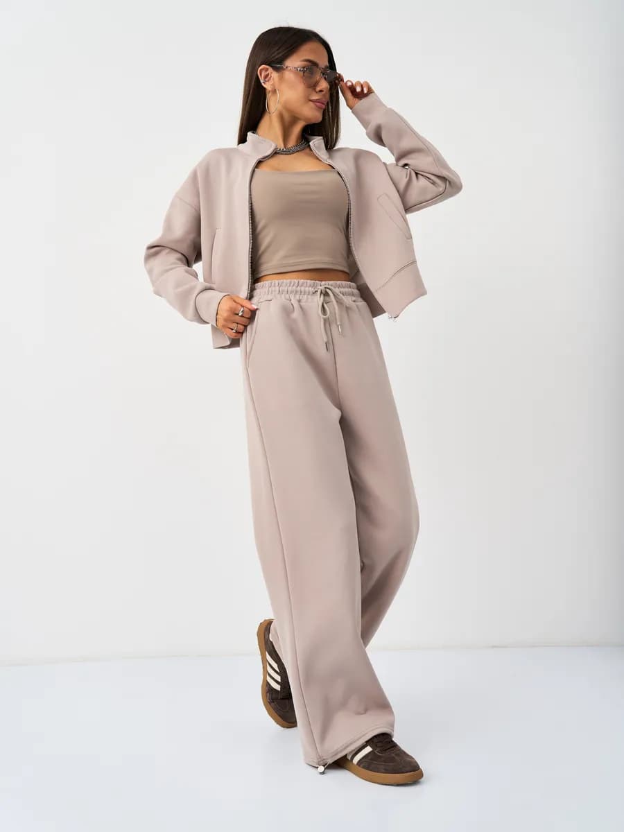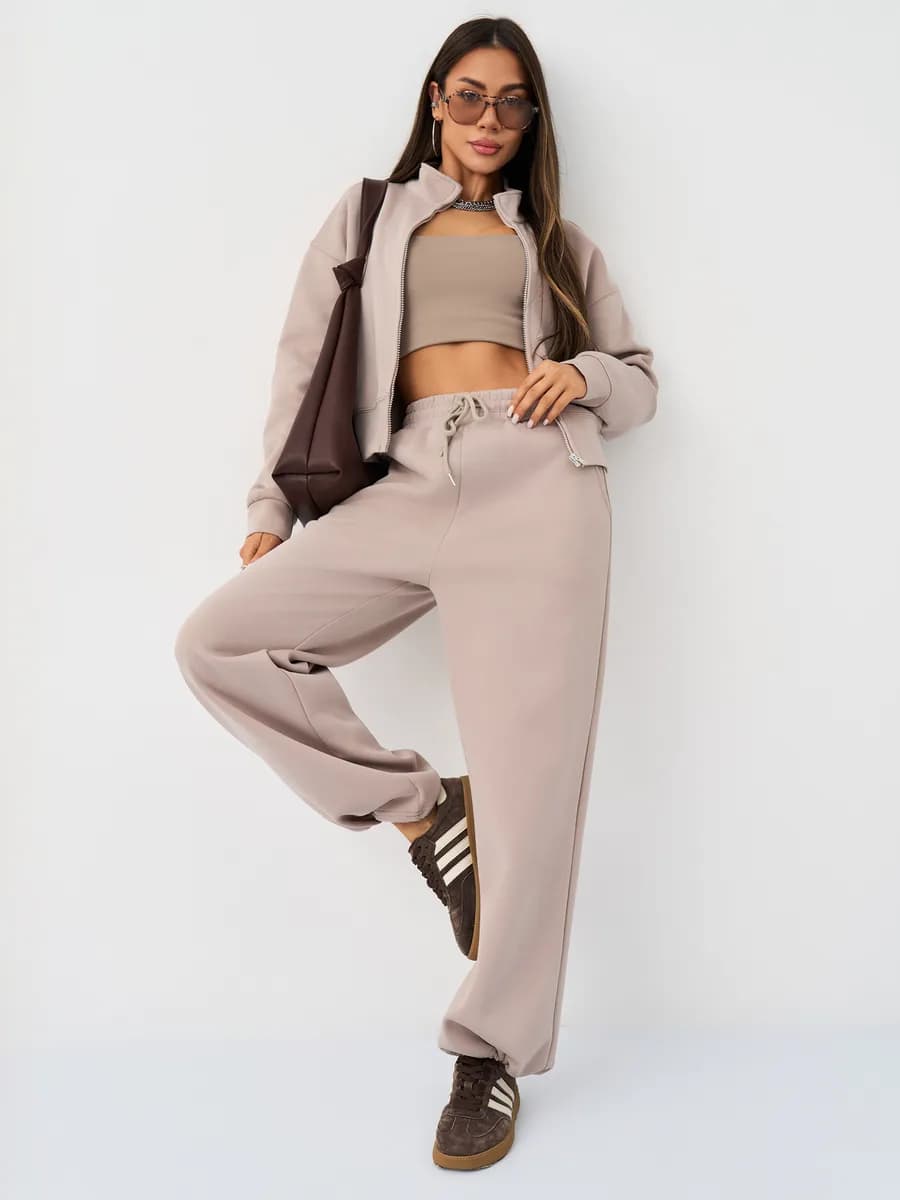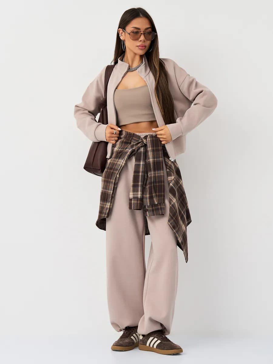 Спортивный костюм с бомбером на молнии и широкими брюками-джоггерами. Воротник-стойка, прорезные карманы, oversize силуэт. Тёплый бежевый оттенок, хлопок с начёсом.