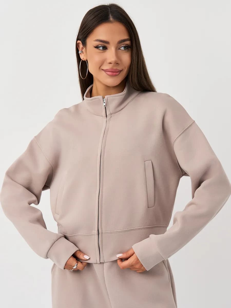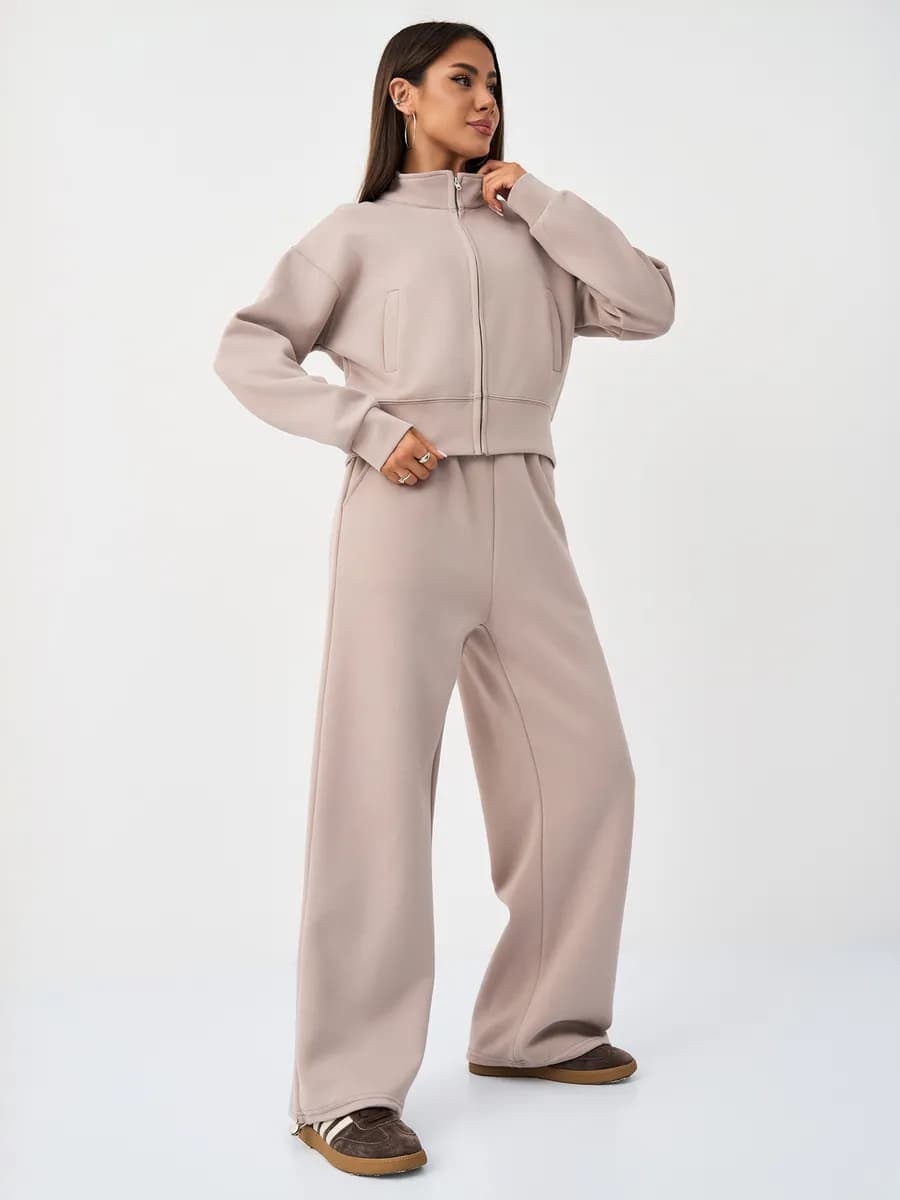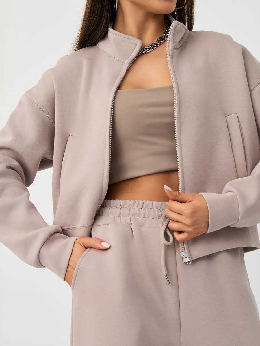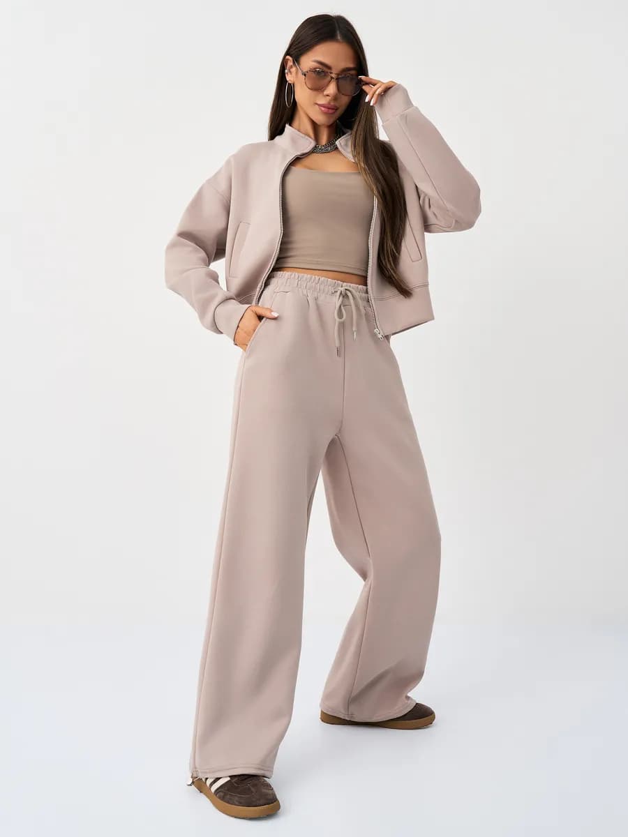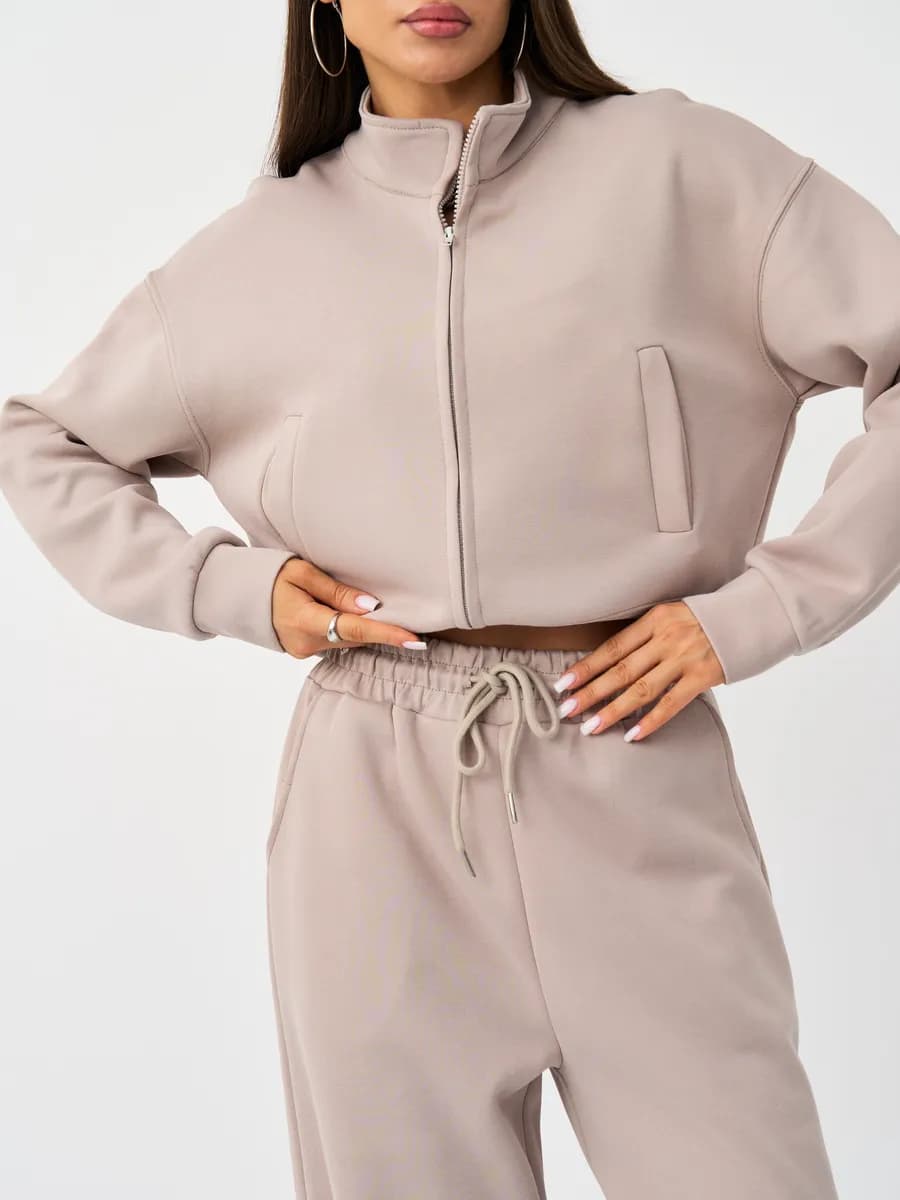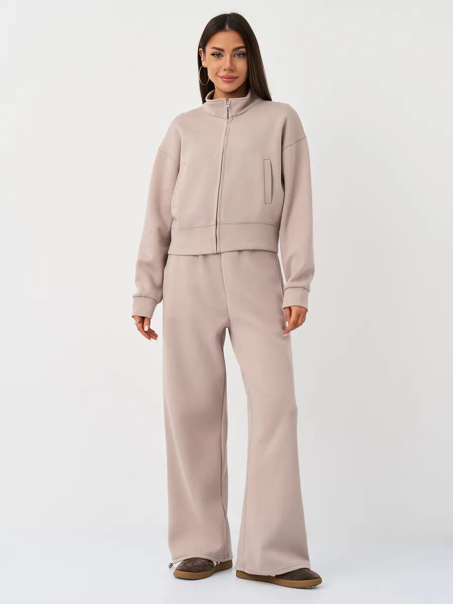 Спортивный костюм с бомбером на молнии и широкими брюками-джоггерами. Воротник-стойка, прорезные карманы, oversize силуэт. Тёплый бежевый оттенок, хлопок с начёсом.