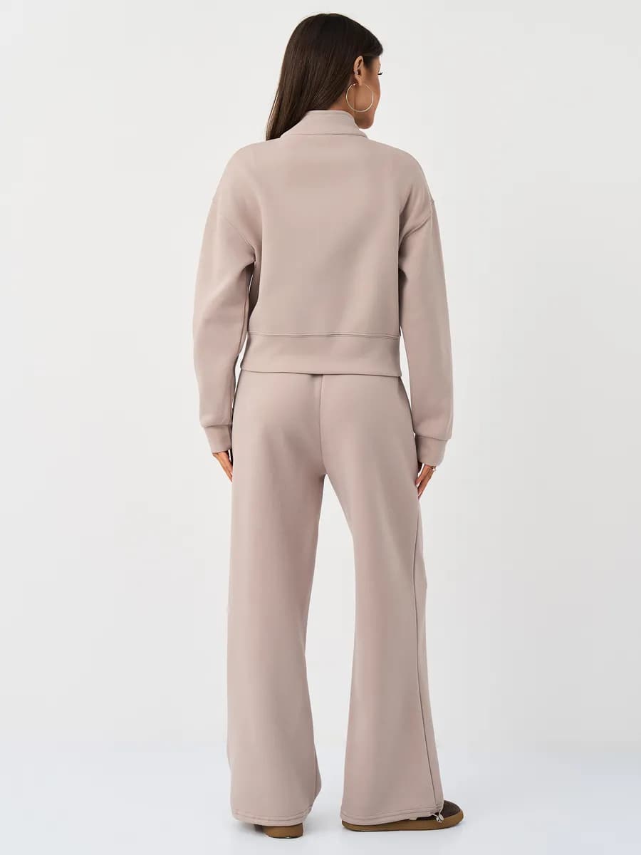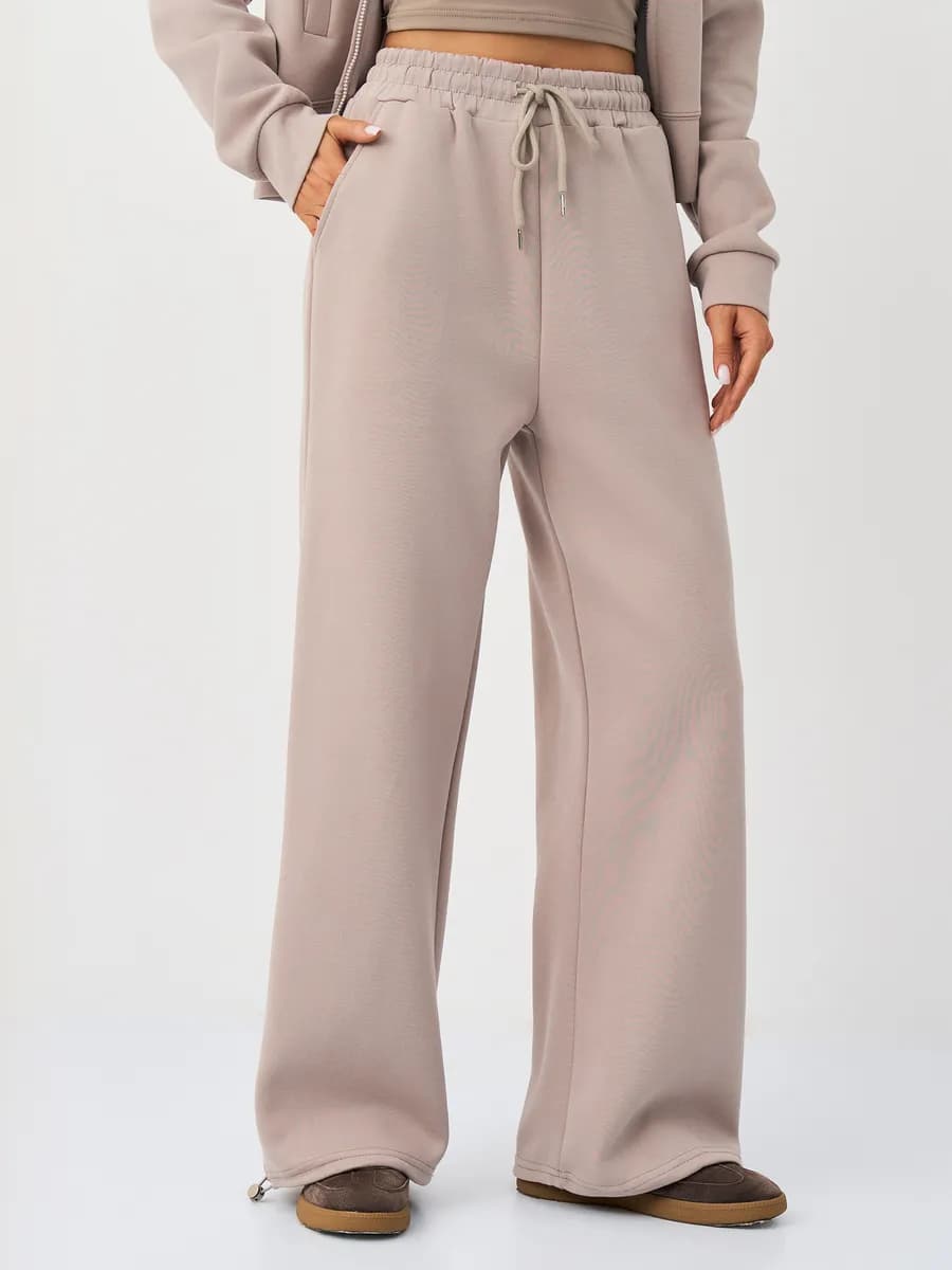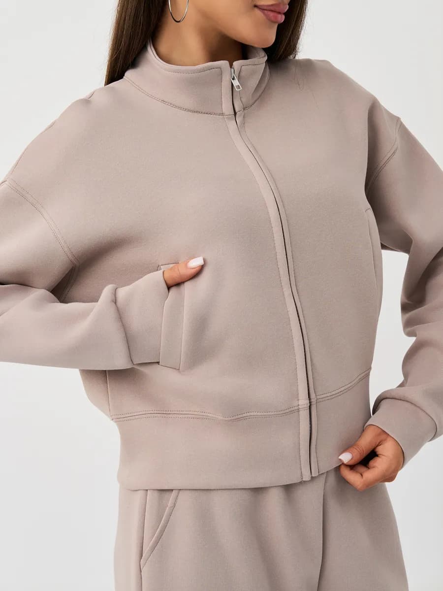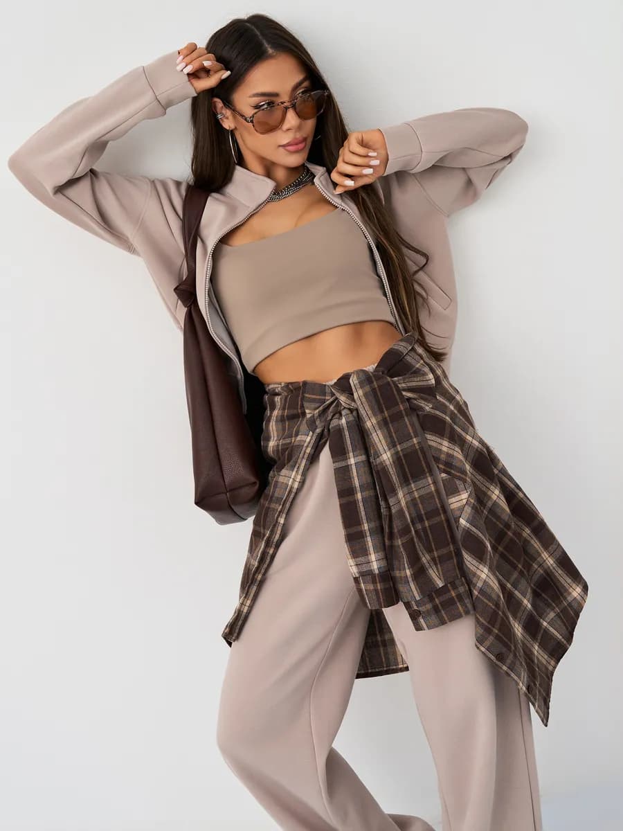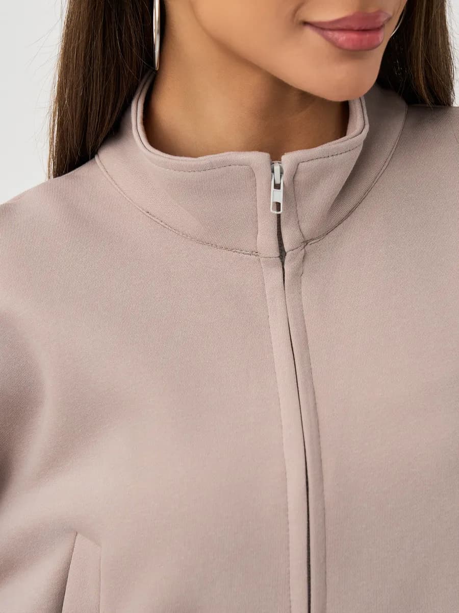 Спортивный костюм с бомбером на молнии и широкими брюками-джоггерами. Воротник-стойка, прорезные карманы, oversize силуэт. Тёплый бежевый оттенок, хлопок с начёсом.